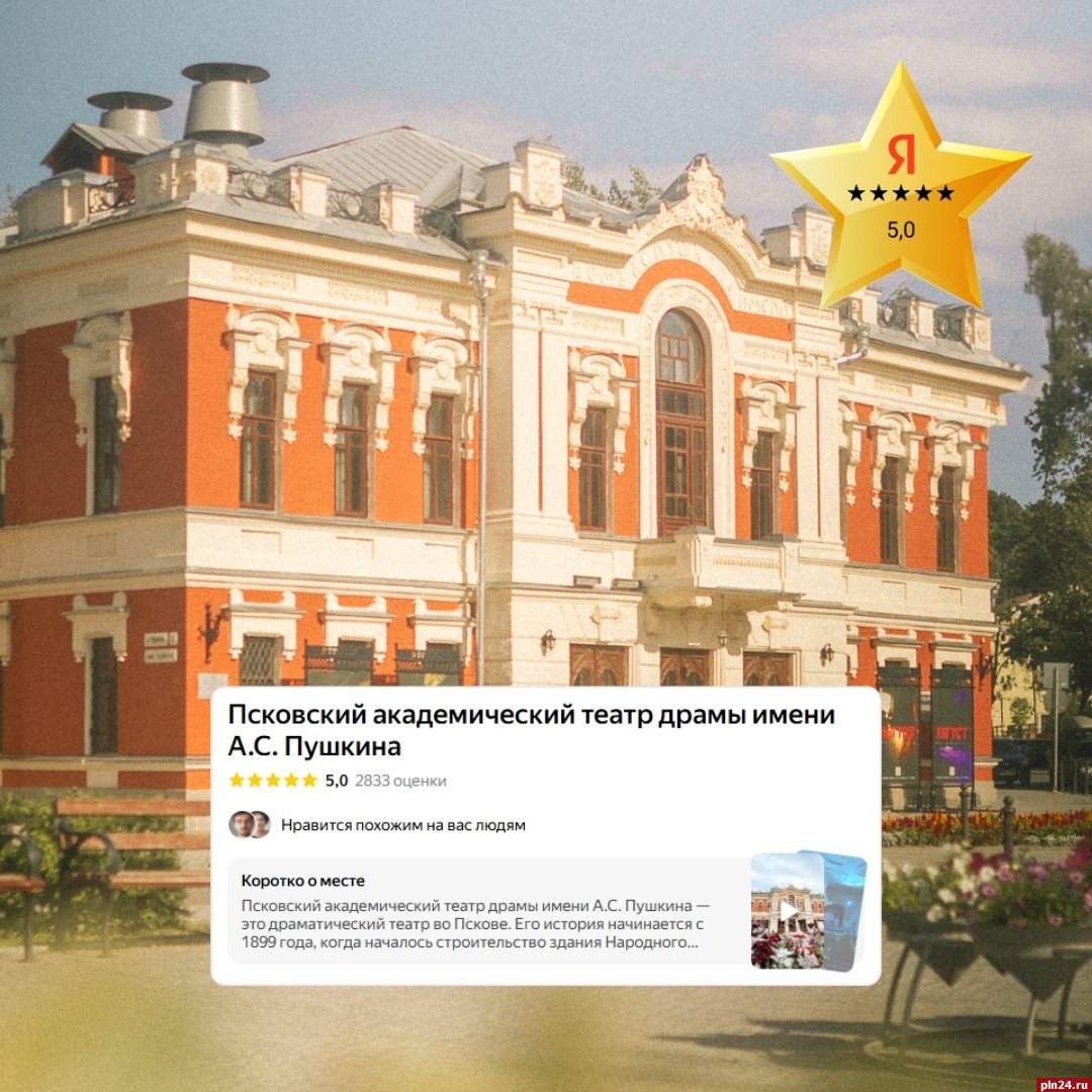 Псковский академический театр драмы имени А.С. Пушкина достиг знакового результата — на сервисе «Яндекс.Карты» и в других сервисах компании театр получил наивысшую пользовательскую оценку 5.0, сообщил театр в своей группе в соцсети «ВКонтакте».