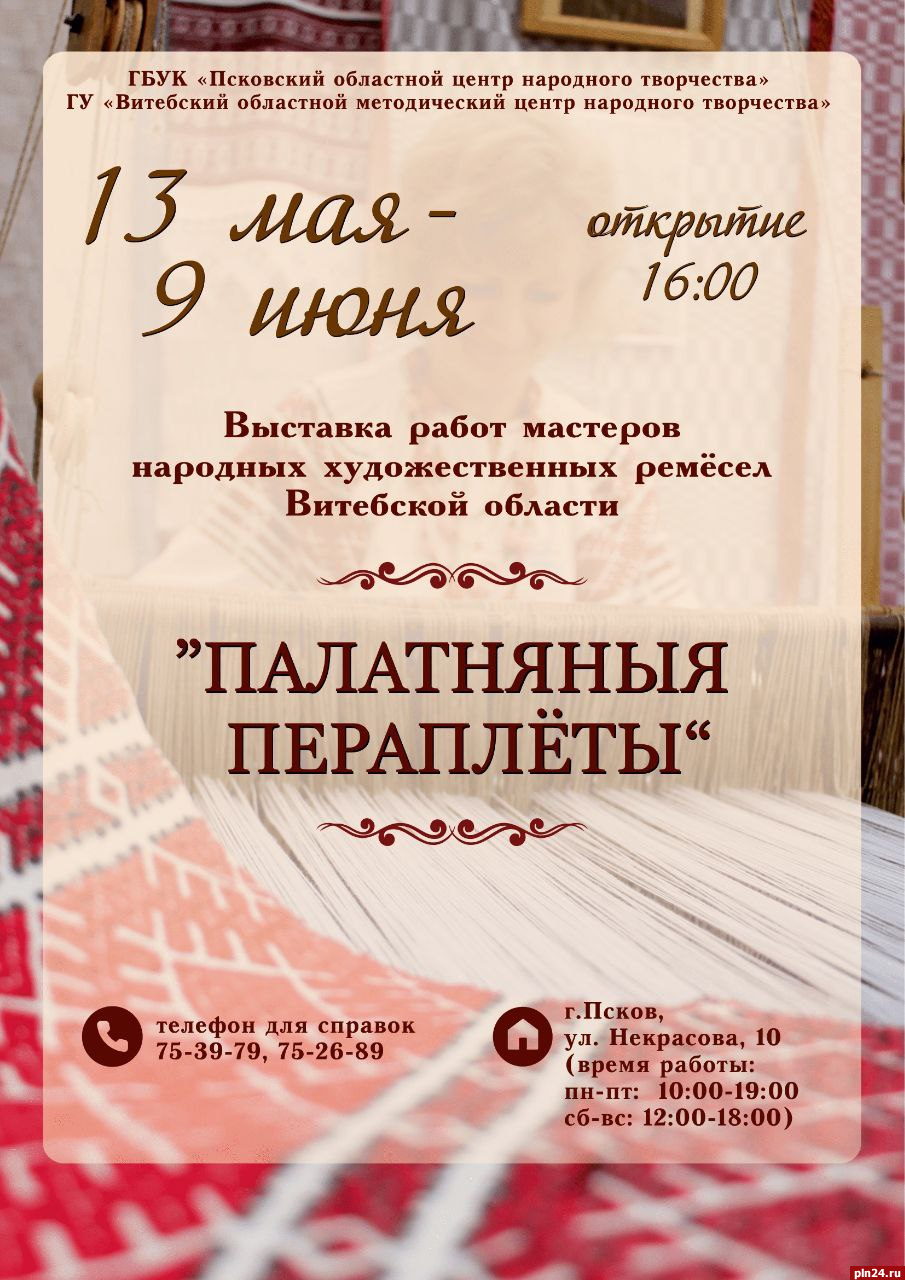 Открытие выставки работ мастеров народных художественных ремесел Витебской области «Палатняныя пераплёты» состоится в Пскове 13 мая, сообщили Псковской Ленте Новостей в Псковском областном центре народного творчества.