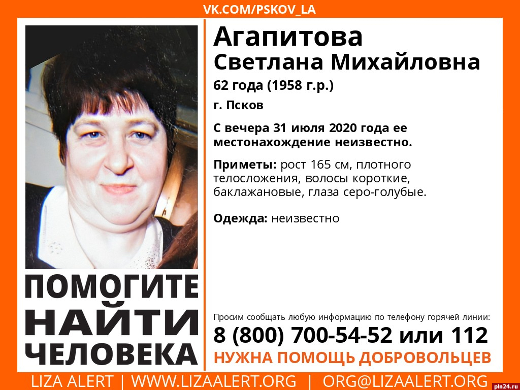 Пропала 62-летняя псковичка Светлана Агапитова. С вечера 31 июля ее местоположение неизвестно. Об этом сообщает поисковый отряд «ЛизаАлерт» Псковской области.