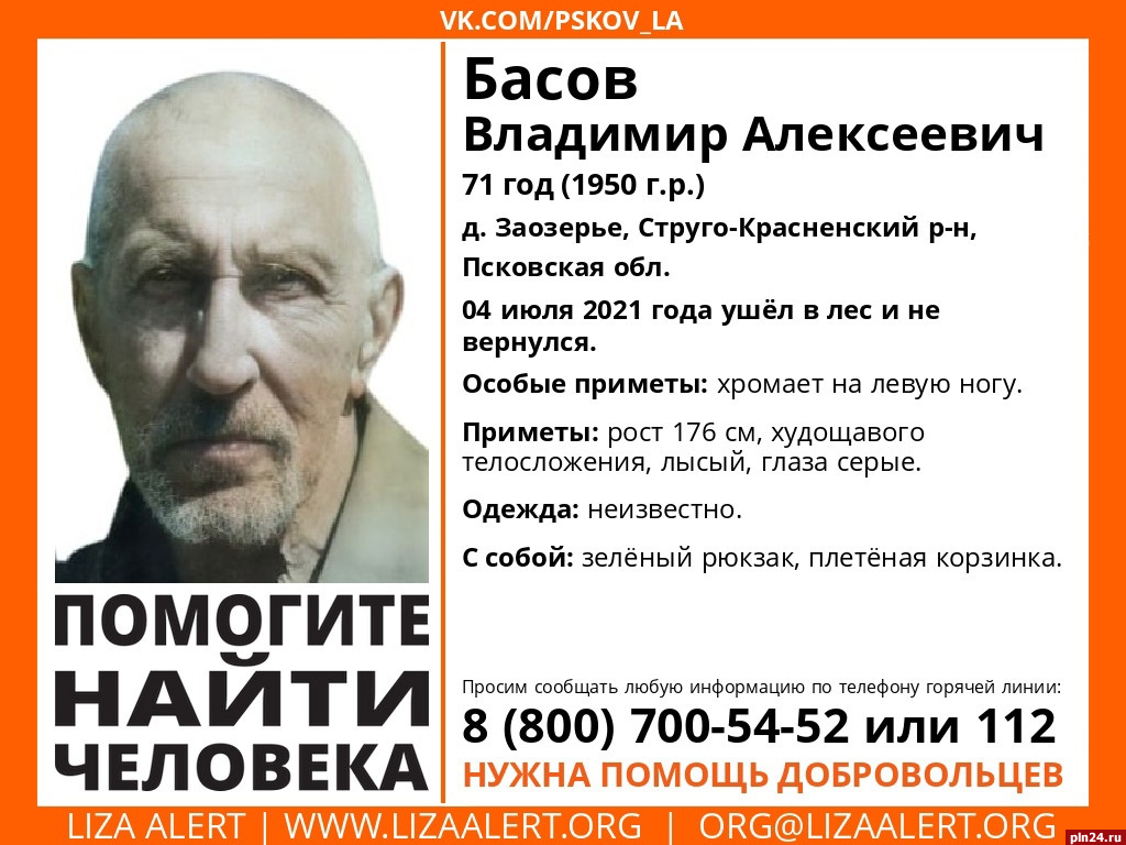 Житель деревни Заозерье Стругокрасненского района ушел в лес 4 июля и не вернулся. Сообщение о пропаже 71-летнего Владимира Басова опубликовано в группе поискового отряда «ЛизаАлерт Псковской области» в социальной сети «ВКонтакте».
