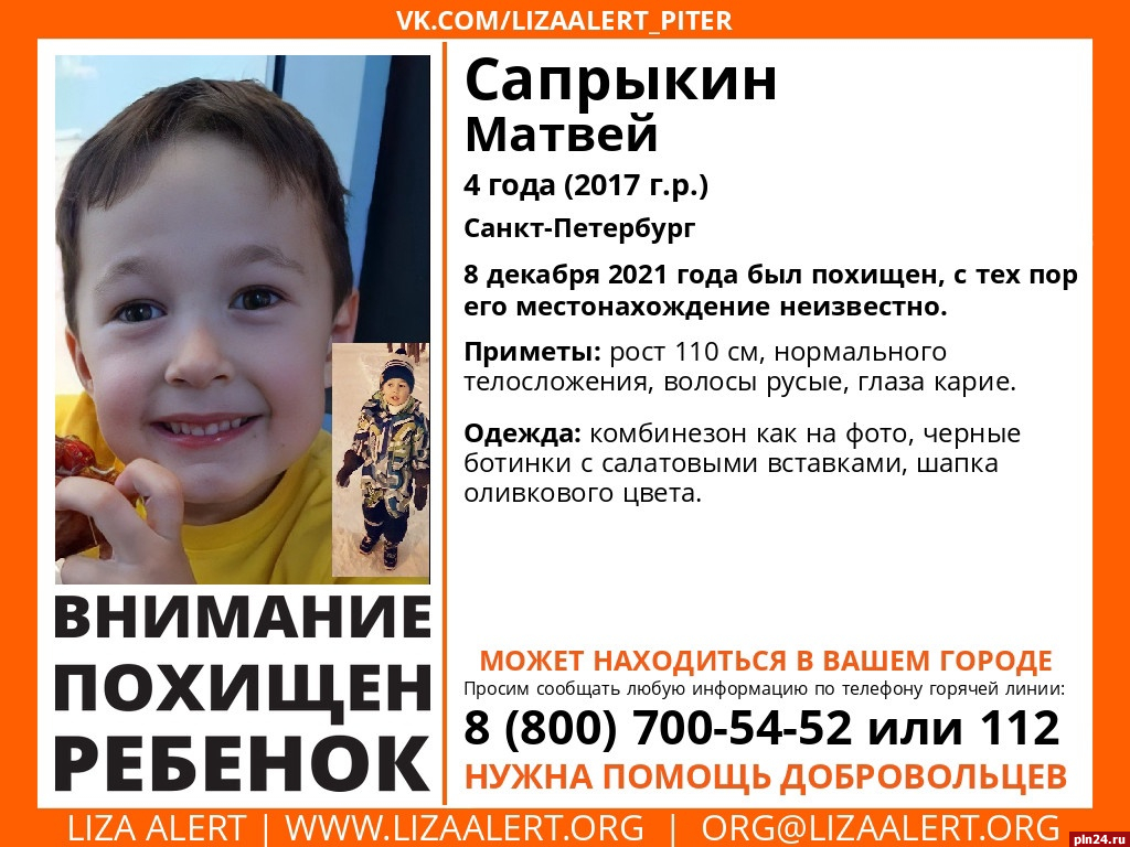 Похищенного ребенка разыскивают в Псковской области. Матвея Сапрыкина 2017 года рождения похитили в Санкт-Петербурге 8 декабря, с тех пор его местоположение неизвестно, об этом Псковской Ленте Новостей сообщили в региональном поисковом отряде «ЛизаАлерт».