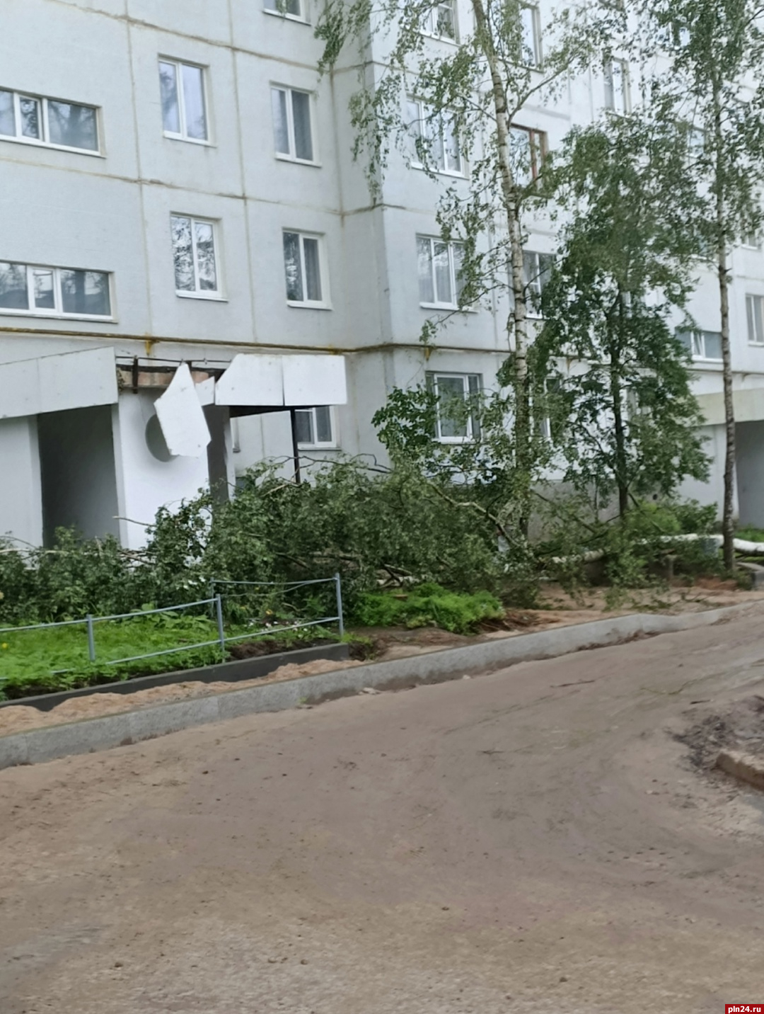Береза упала и повредила козырек подъезда на Рижском проспекте, 67 в Пскове, сообщается в группе «Справедливая жесть города Пскова».