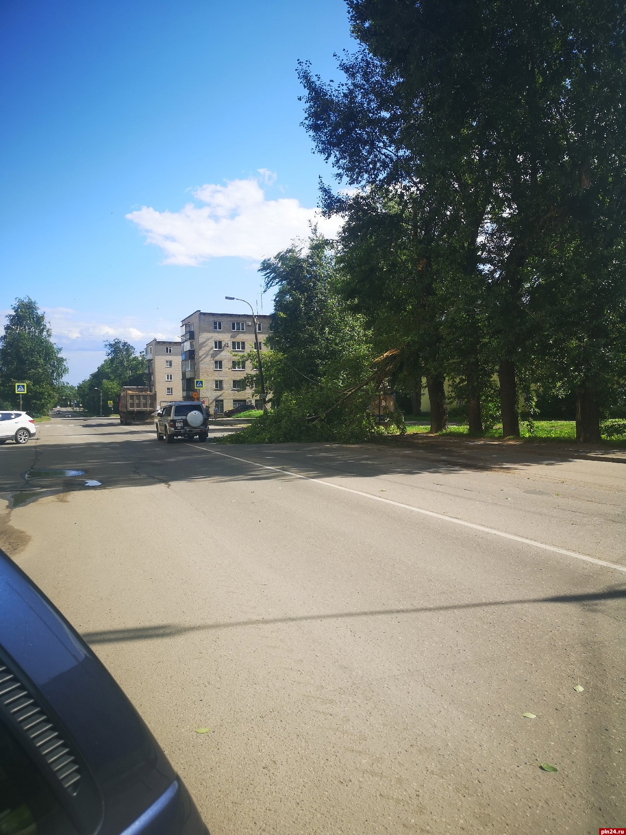 Поваленные деревья фиксировали псковичи 29 июня во время непогоды.