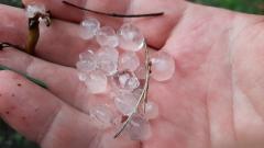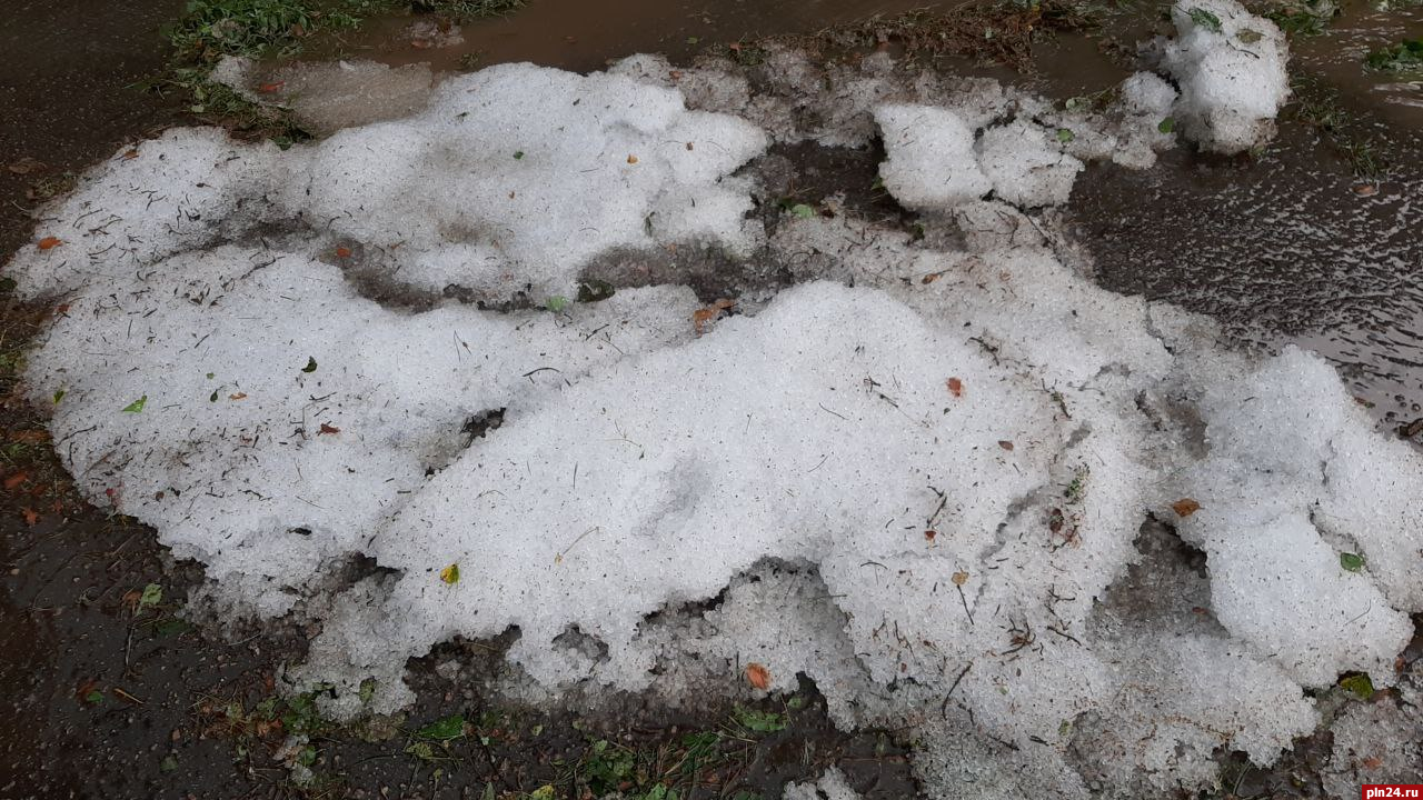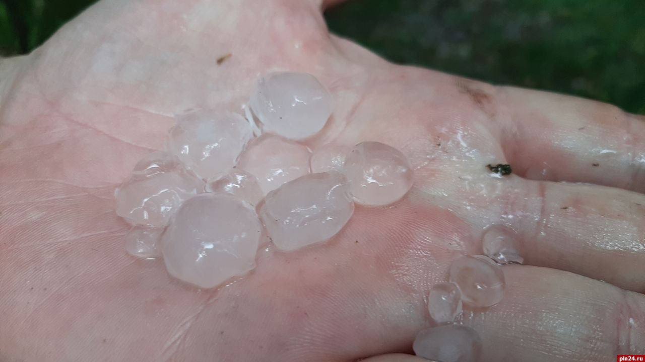 Также отмечается сильный туман над деревней. Кроме того, очевидцы делятся фотографиями града. «Град размером со сливу», - уточнили они.