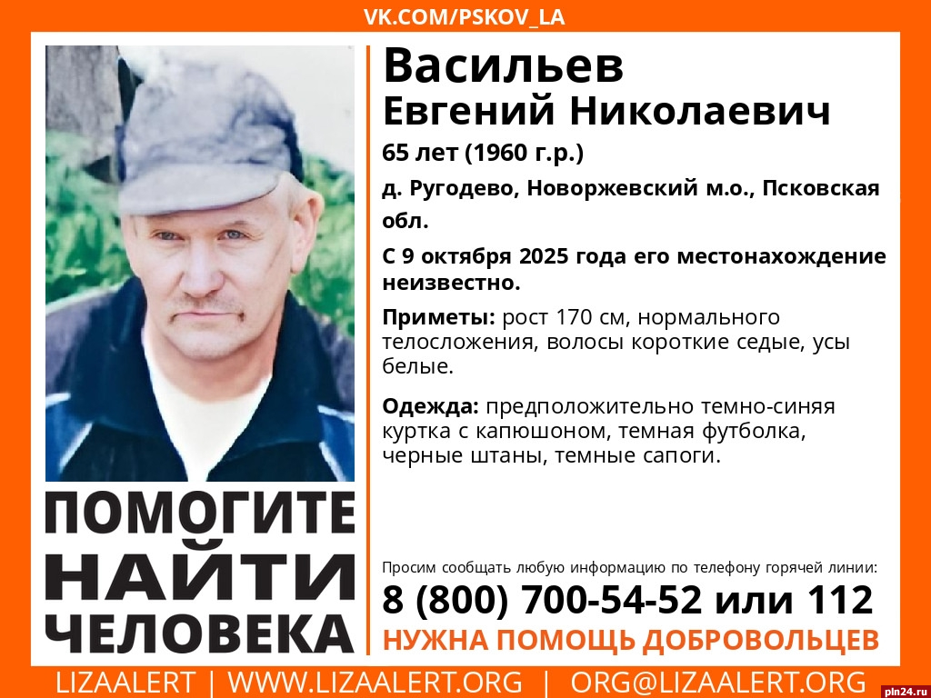 65-летний Евгений Васильев пропал в деревне Ругодево Новоржевского района. С 9 октября его местонахождение неизвестно, сообщили Псковской Ленте Новостей в региональном отделении поискового отряда «ЛизаАлерт».