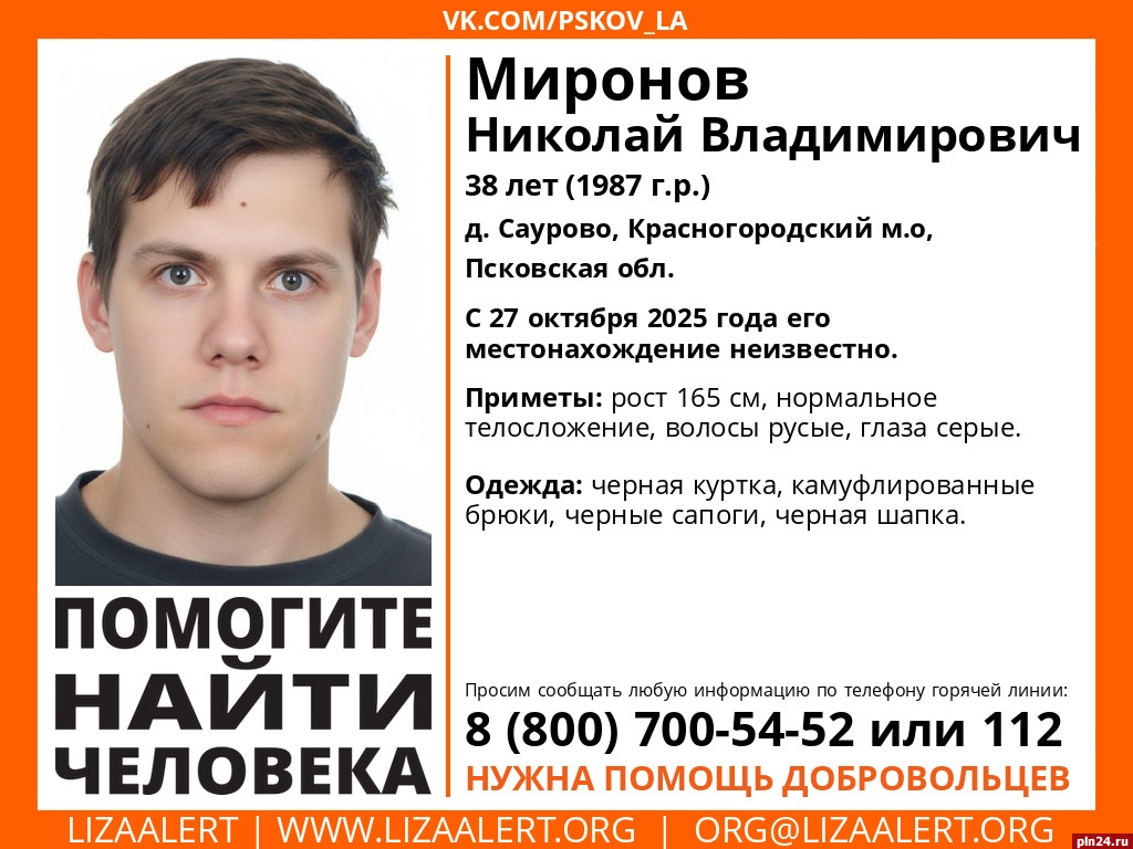 38-летний Николай Миронов пропал в деревне Саурово Красногородского муниципального округа. С 27 октября его местонахождение неизвестно, сообщили Псковской Ленте Новостей в региональном отделении поискового отряда «ЛизаАлерт».