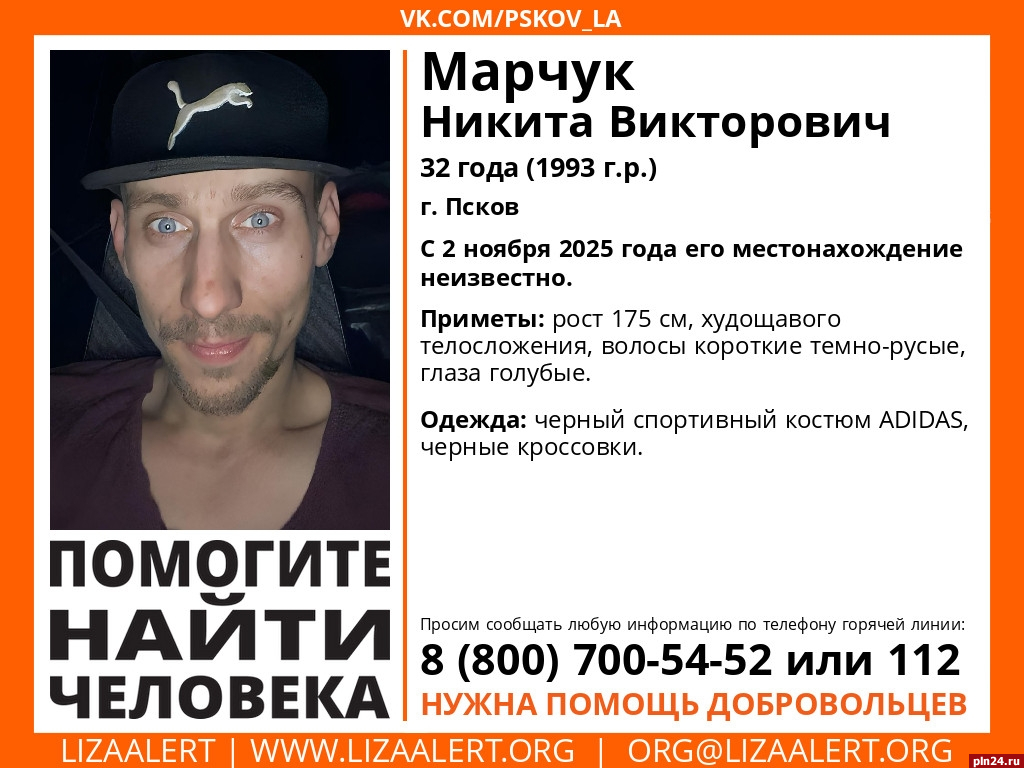 32-летний Никита Марчук пропал в Пскове. С 2 ноября его местонахождение неизвестно, сообщили Псковской Ленте Новостей в региональном отделении поискового отряда «ЛизаАлерт».