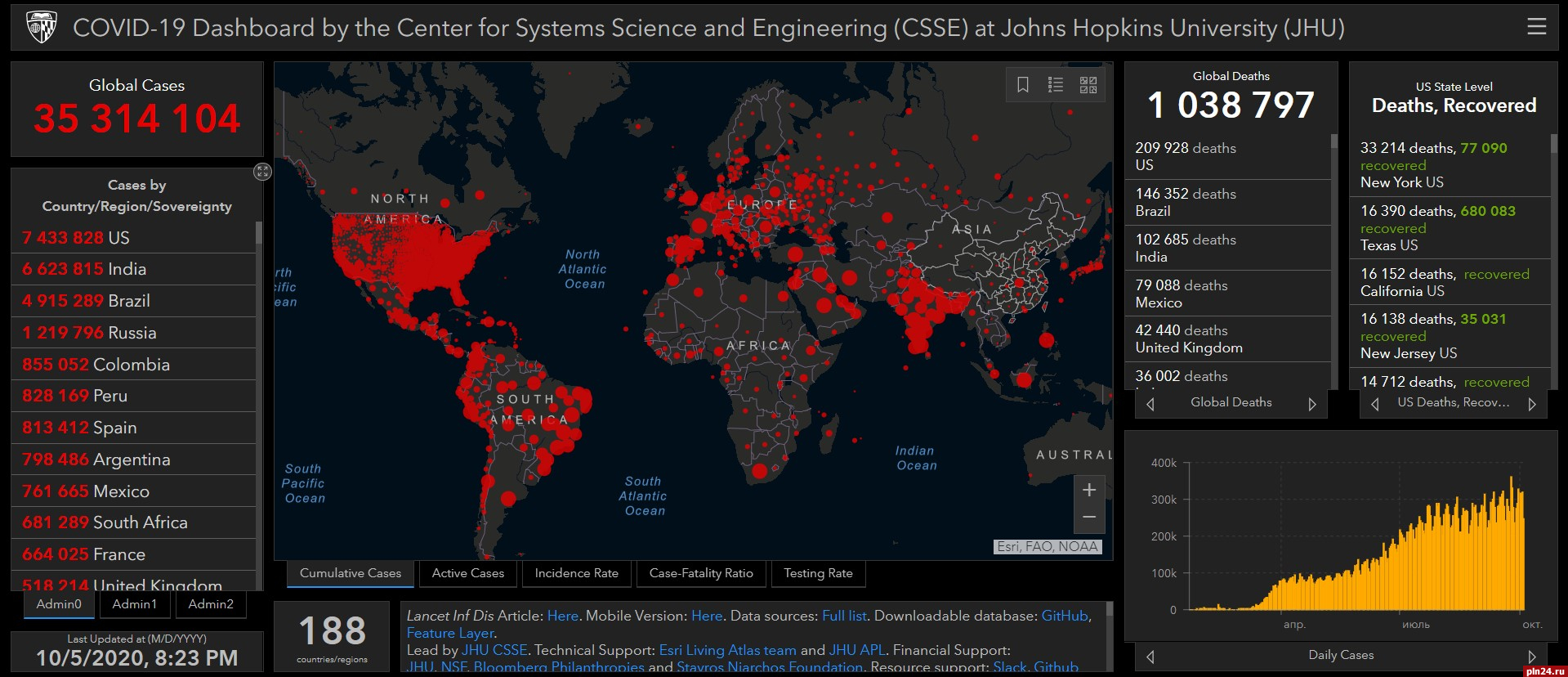 Всего 35 млн 314 тысяч 104 случая заражения коронавирусной инфекцией COVID-19 зарегистрировано в мире по состоянию на вечер 5 октября. Соответствующую информацию опубликовал университет Джонса Хопкинса.
