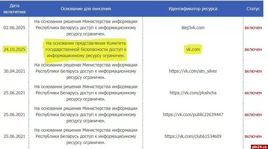 Сообщение сопровождается скриншотом «Списка ограниченного доступа» интернет-ресурсов. Включение в него сайта vk.com датировано сегодняшним днем, пишет РИА Новости.