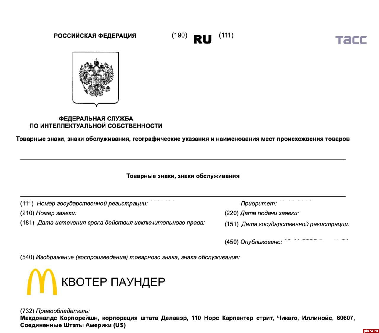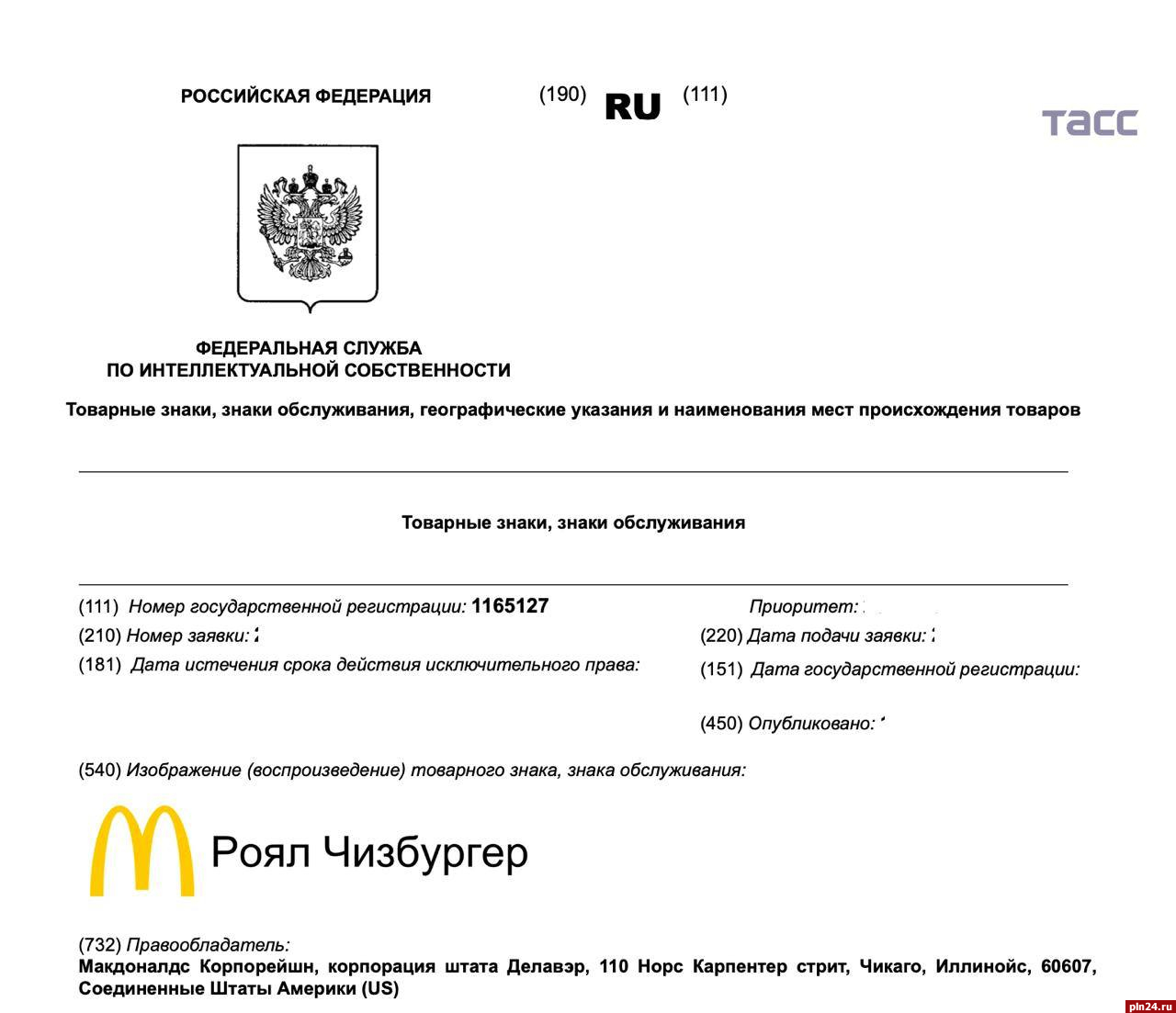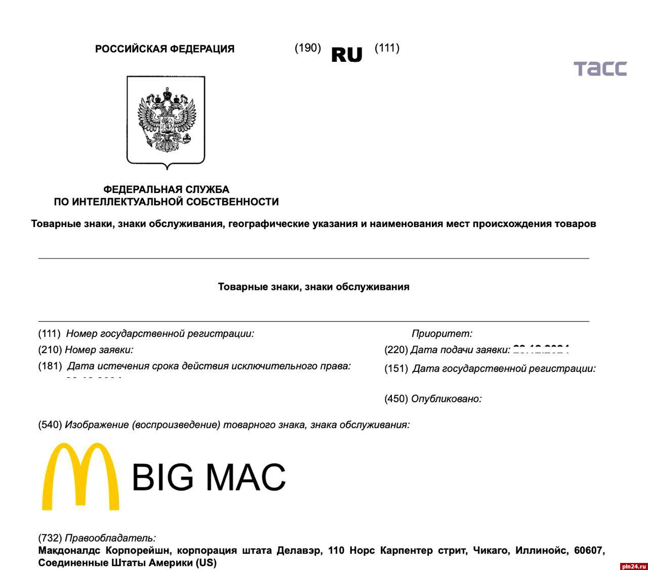 Все заявки на регистрацию товарных знаков были поданы из США в декабре 2024 года компанией «Макдоналдс Корпорейшн». Шесть знаков с названием блюд зарегистрированы по одному классу (№ 12) международной классификации товаров и услуг (МКТУ) — сэндвичи, бургеры, гамбургеры, чизбургеры. Знак «МакДоставка» зарегистрирован по двум классам (№ 39, 43) МКТУ — услуги по доставке продуктов питания, услуги ресторанов, услуги по приготовлению блюд и доставке их на дом, пишет ТАСС.
