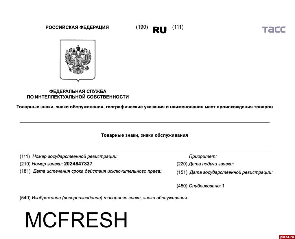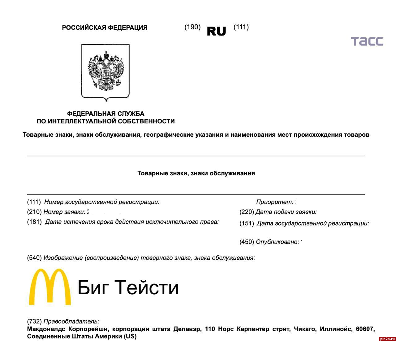 Среди зарегистрированных товарных знаков - «Биг тейсти», «Квотер паундер», «Роял чизбургер», McFresh, McFlurry, Big Mac и «МакДоставка». Часть товарных знаков блюд идут с фирменной буквой «М» перед названием, следует из данных Роспатента.