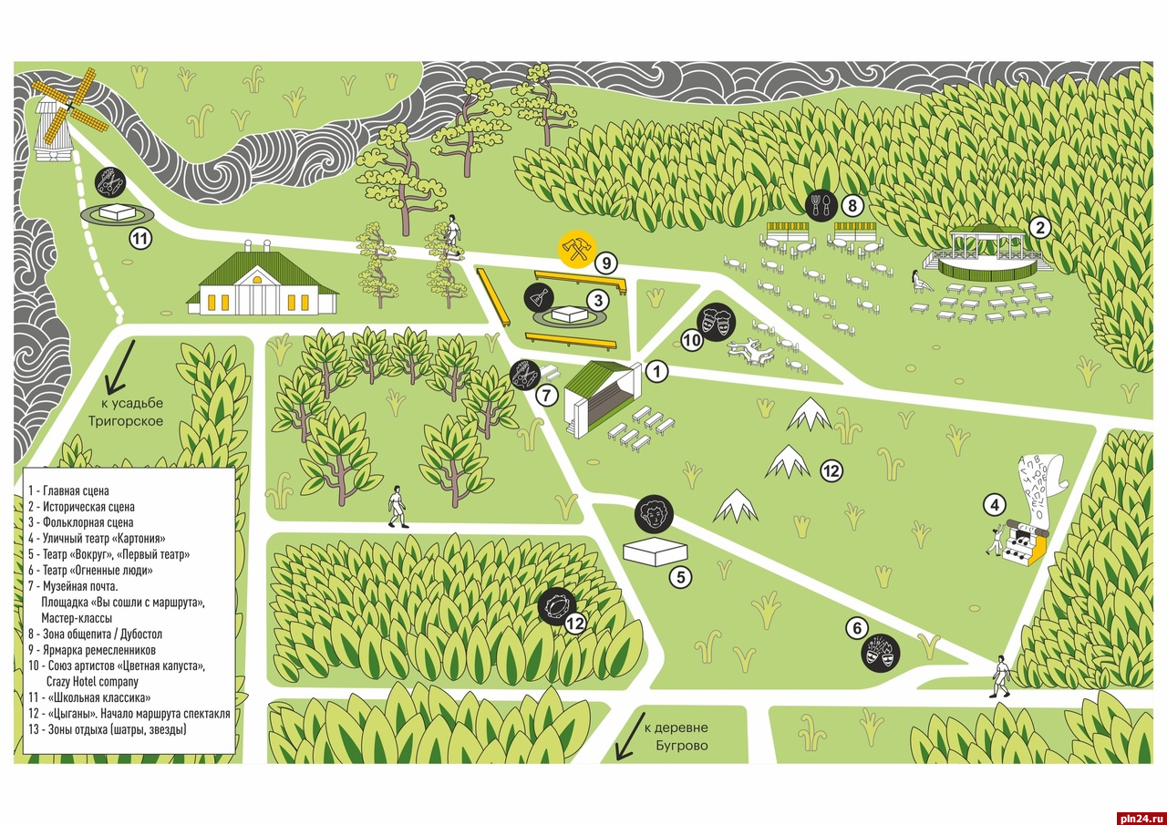 Карту размещения площадок Дней Пушкинской поэзии и русской культуры в музее-заповеднике «Михайловское» опубликовала Театрально-концертная дирекция Псковской области.