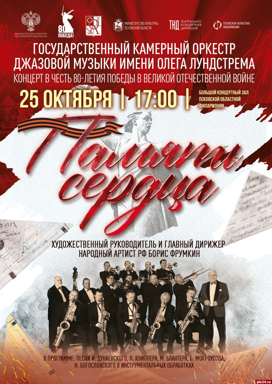 Инструментальные обработки известных мелодий времён Великой Отечественной войны услышат псковичи на концерте «Память сердца» к 80-летию Победы 25 октября на сцене Псковской областной филармонии, сообщили Псковской Ленте Новостей в пресс-службе Театрально-концертной дирекции Псковской области.