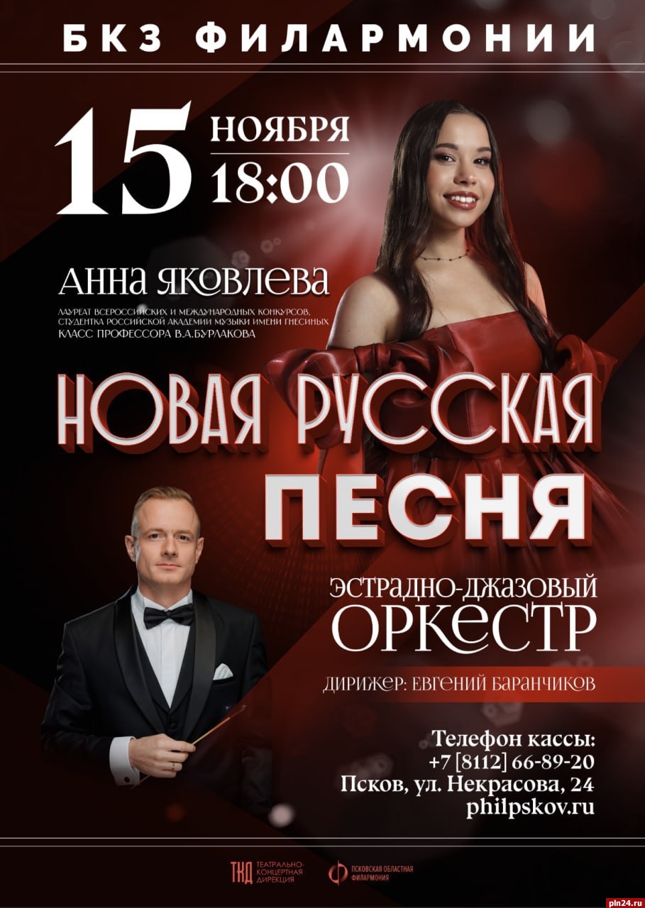 Концерт «Новая русская песня» пройдёт в Псковской областной филармонии 15 ноября, сообщили Псковской Ленте Новостей в Театрально-концертной дирекции Псковской области.