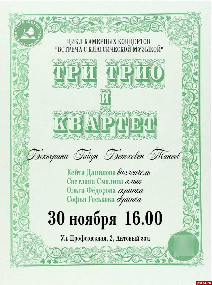 Библиотека имени Курбатова приглашает ценителей классической музыки на концерт «Три трио и квартет». Мероприятие состоится 30 ноября и представит публике шедевры европейской камерной музыки в исполнении ансамбля артистов филармонии. Об этом Псковской Ленте Новостей сообщили в библиотеке.