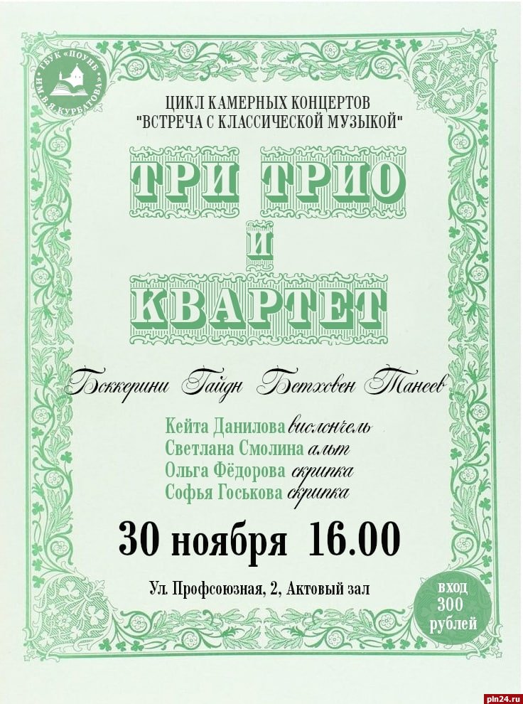 Концерт «Три трио и квартет» пройдёт в Псковская областная библиотека имени Курбатова сегодня, 30 ноября. На мероприятие прозвучат шедевры камерной музыки. Организатор – ансамбль артистов Псковской областной филармонии. Об этом сообщили в библиотеке.