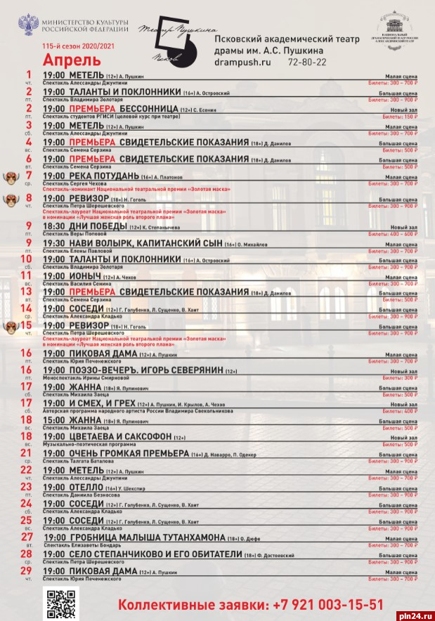 Афишу Псковского театра драмы можно посмотреть на официальном сайте.