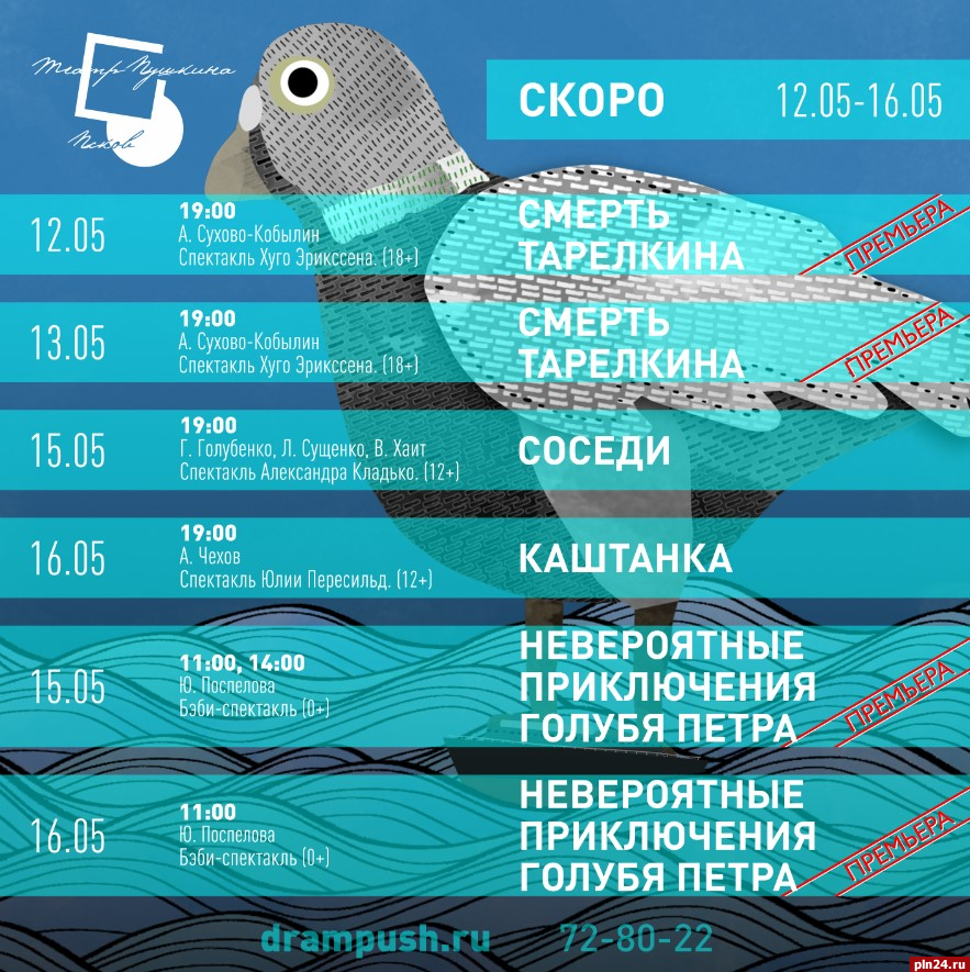 Две премьеры представит Псковский театр драмы на этой неделе. 12 и 13 мая состоится первая премьера года на большой сцене – спектакль «Смерть Тарелкина». На выходных новым бэби-спектаклем «Невероятные приключения голубя Петра» откроется «Маленький театр» – уютный зал, где будут играть только детские спектакли.