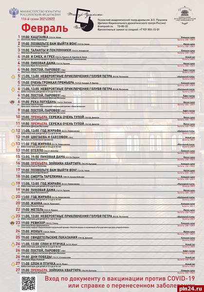 Псковский академический театр драмы имени А. С. Пушкина сформировал февральский репертуар и открыл продажи билетов. Об этом Псковской Ленте Новостей сообщили в пресс-службе театра.