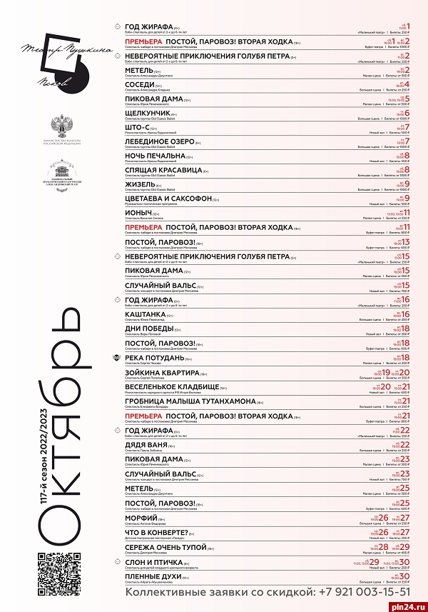 Псковский академический театр драмы имени А. С. Пушкина опубликовал афишу на октябрь. Об этом Псковской Ленте Новостей сообщили в пресс-службе театра.
