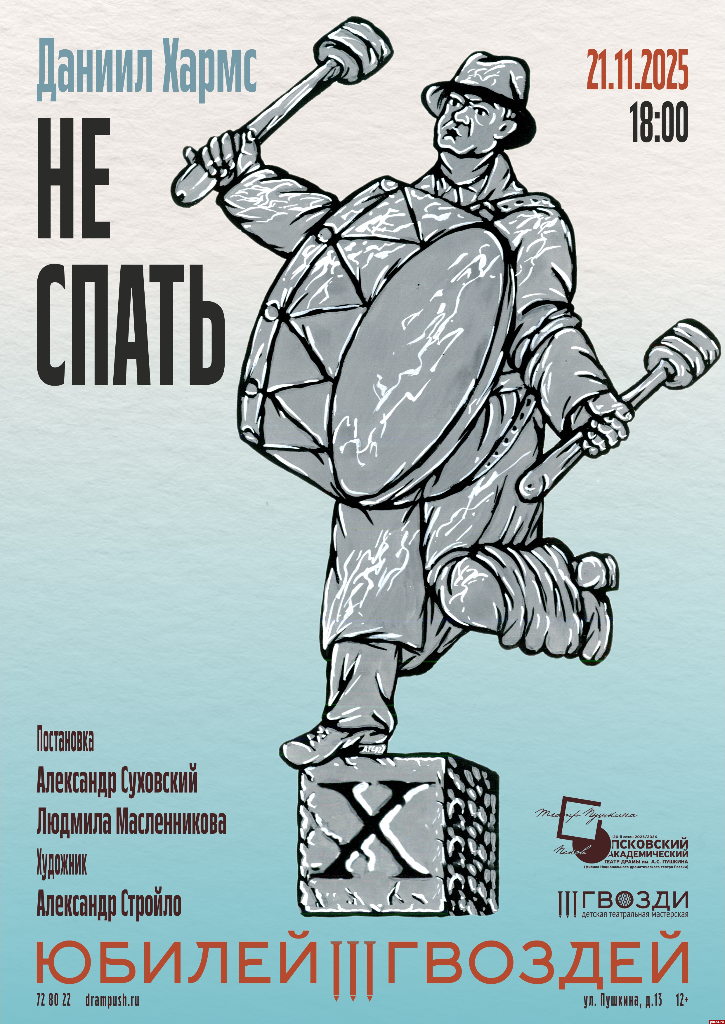 Показ спектакля «Не спать!» к 10-летию мастерской состоится 21 ноября в 18:00 в новом зале Псковского академического театра драмы имени А. С. Пушкина. Подробнее можно узнать на сайте.