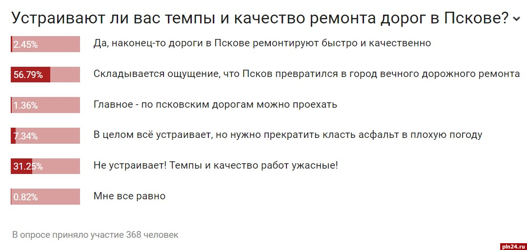 Большинство респондентов Псковской Ленты Новостей (56,79%) считают, что Псков превратился в город вечного дорожного ремонта. Это следует из опроса, в котором приняли участие 368 человек.