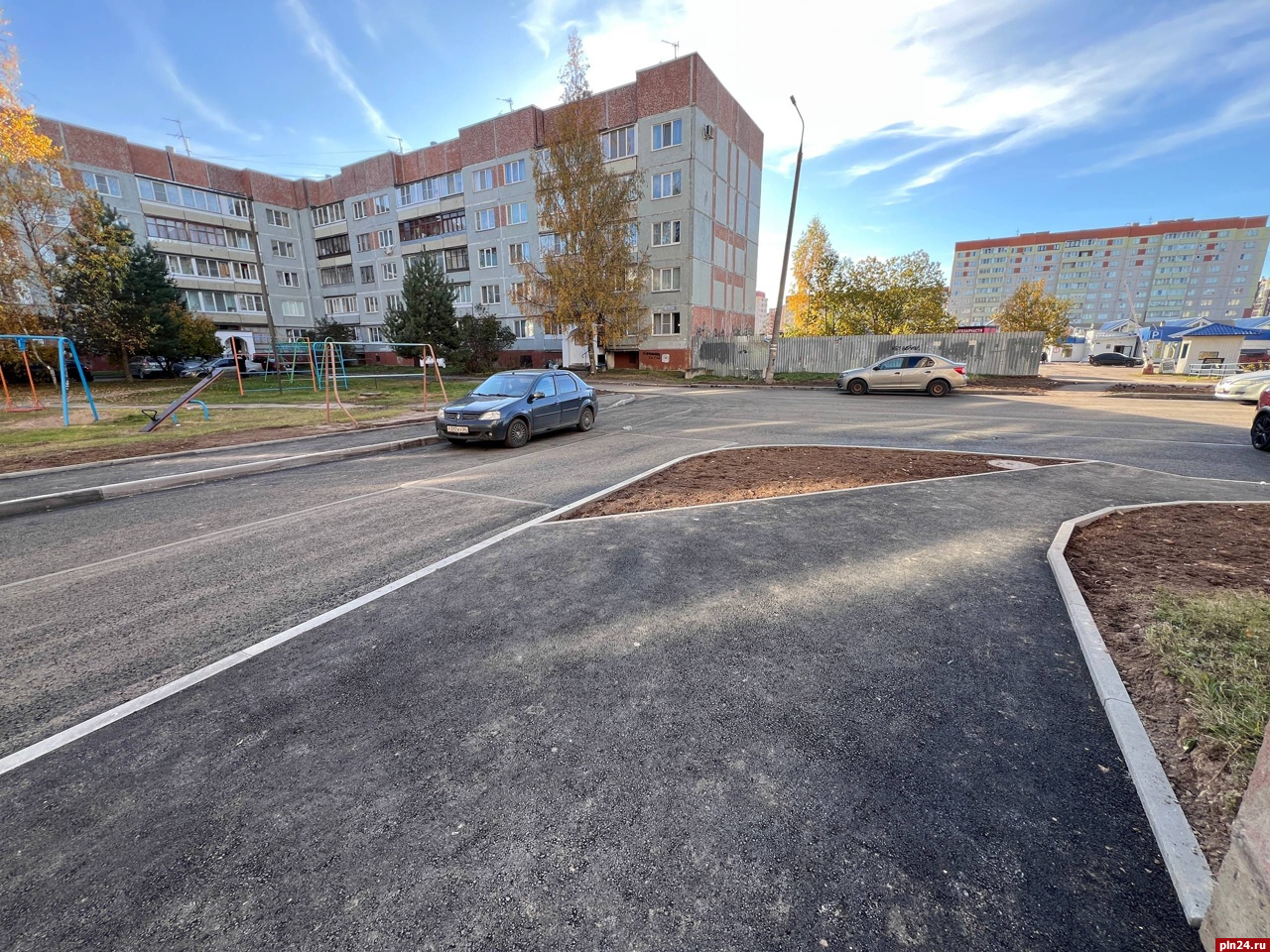 В междворовом проезде вблизи «синего рынка» теперь проложен новый асфальт, обновлены тротуары и освежена зеленая зона.