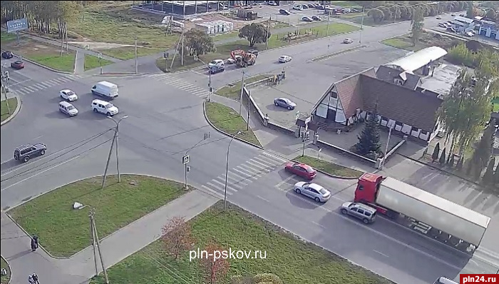 В Пскове на Рижском проспекте водитель фуры врезался в легковой автомобиль. Видеокамера Pskovline зафиксировала момент происшествия 9 октября в 11.52 у дома №92-А.