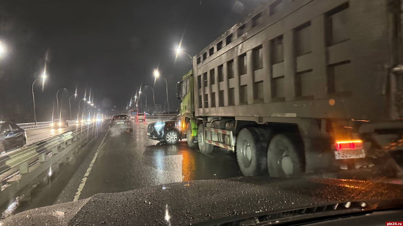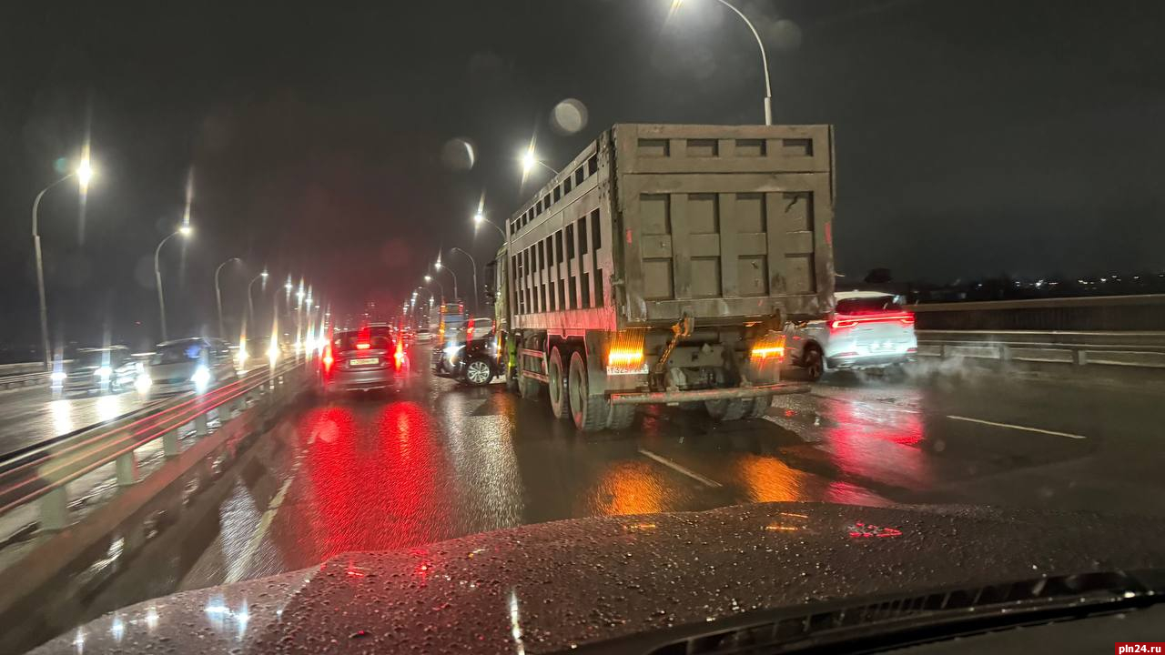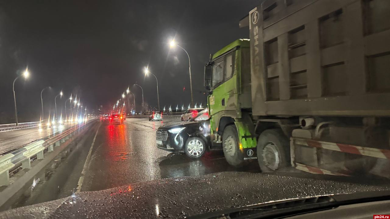 Столкновение грузовика и легкового автомобиля произошло вечером в Пскове на мосту Александра Невского, передает корреспондент Псковской Ленты Новостей.