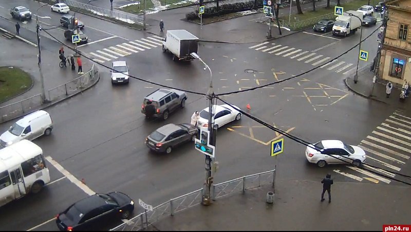 ДТП произошло в Пскове на «четырех углах» в связи с проездом спецтехники. Момент столкновения на перекрестке Рижского проспекта и улицы Максима Горького зафиксировала камера видеонаблюдения Pskovline 2 декабря в 10.26.