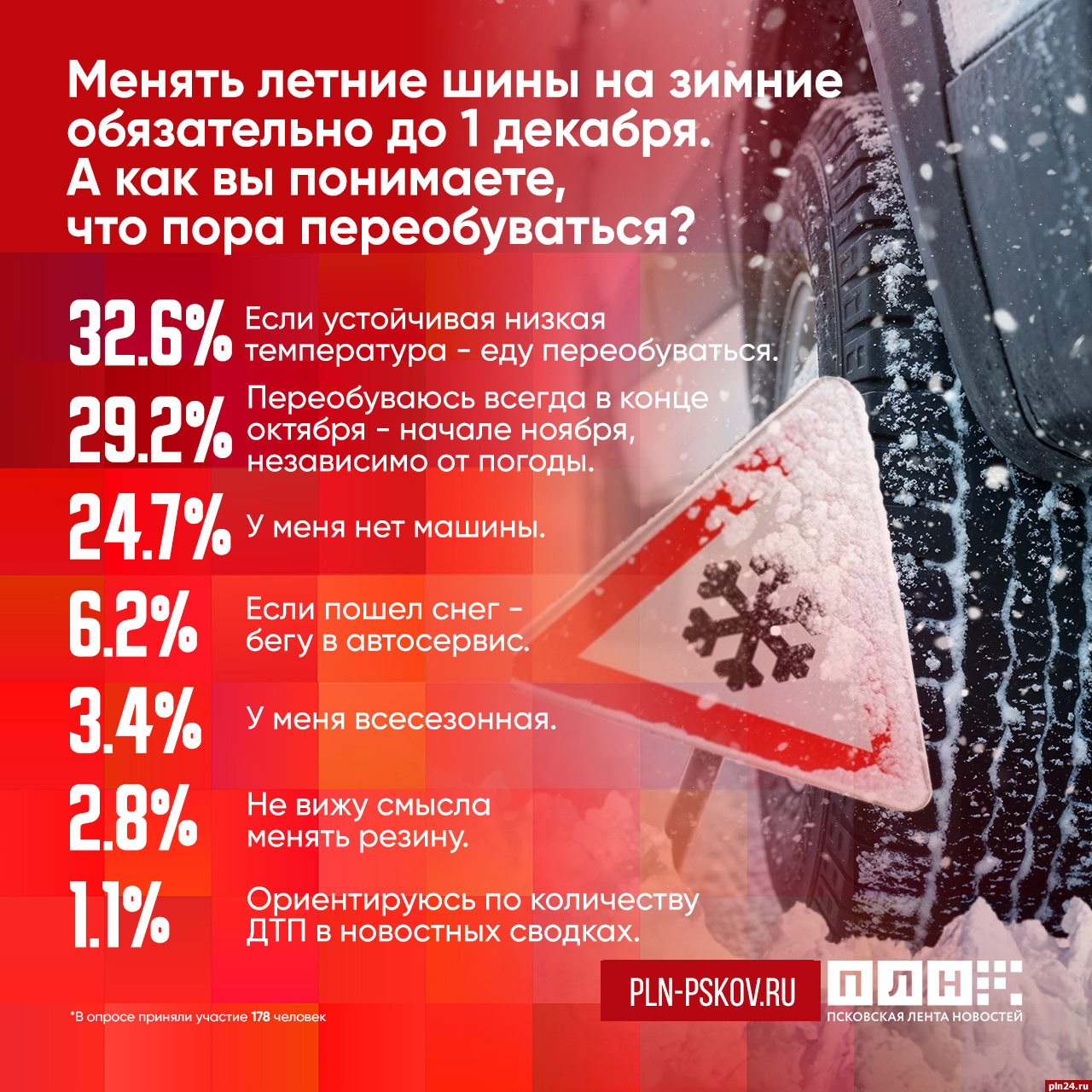 Большинство респондентов Псковской Ленты Новостей (32,6%) едут «переобувать» автомобиль при устойчивой низкой температуре. Это следует из опроса, в котором приняли участие 178 человек.