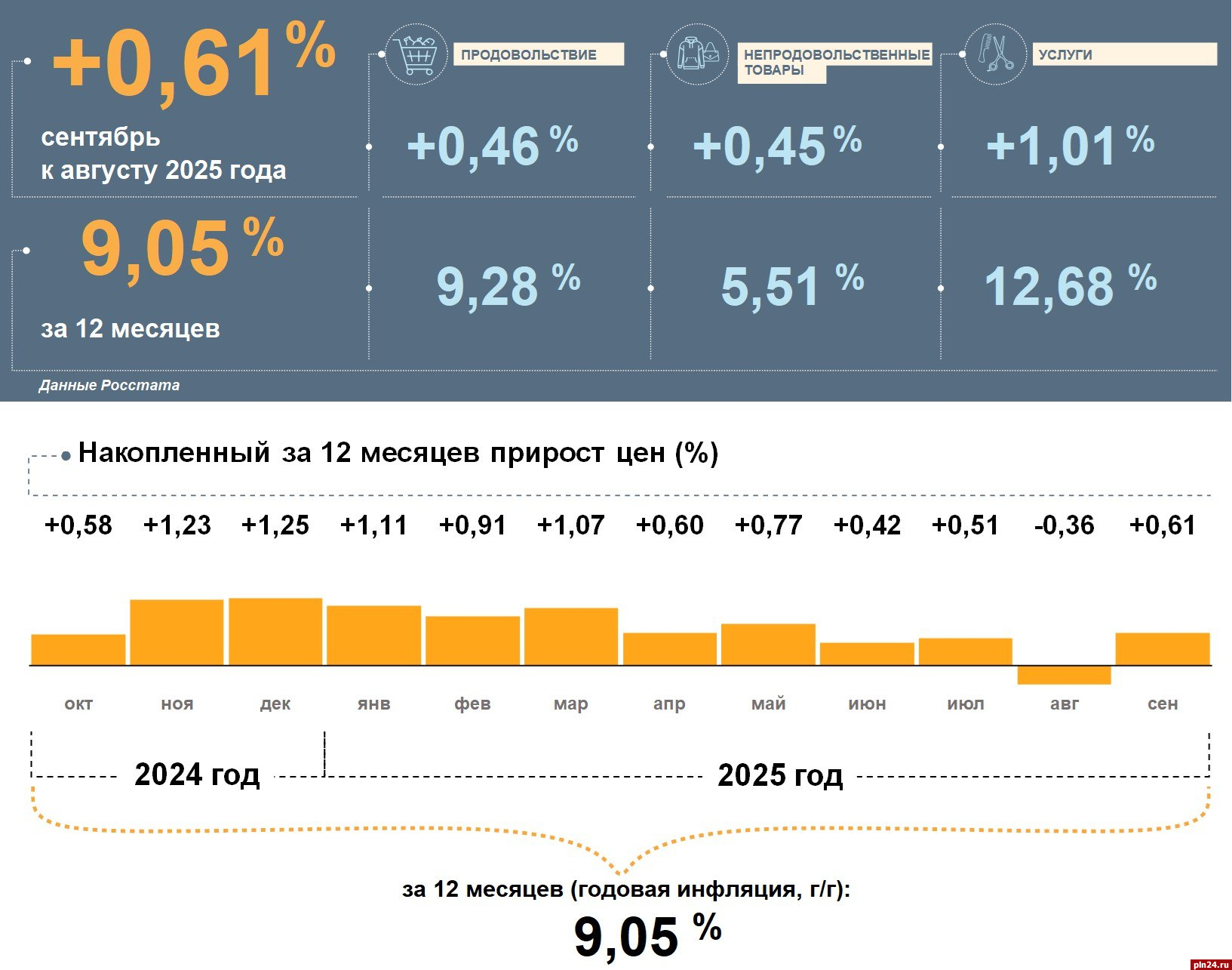 Цены в Псковской области в сентябре, по данным Росстата, выросли на 0,61% к августу. Годовая инфляция ускорилась и составила 9,05%. Это выше, чем в целом по стране (7,98%), сообщили Псковской Ленте Новостей в Центробанке.