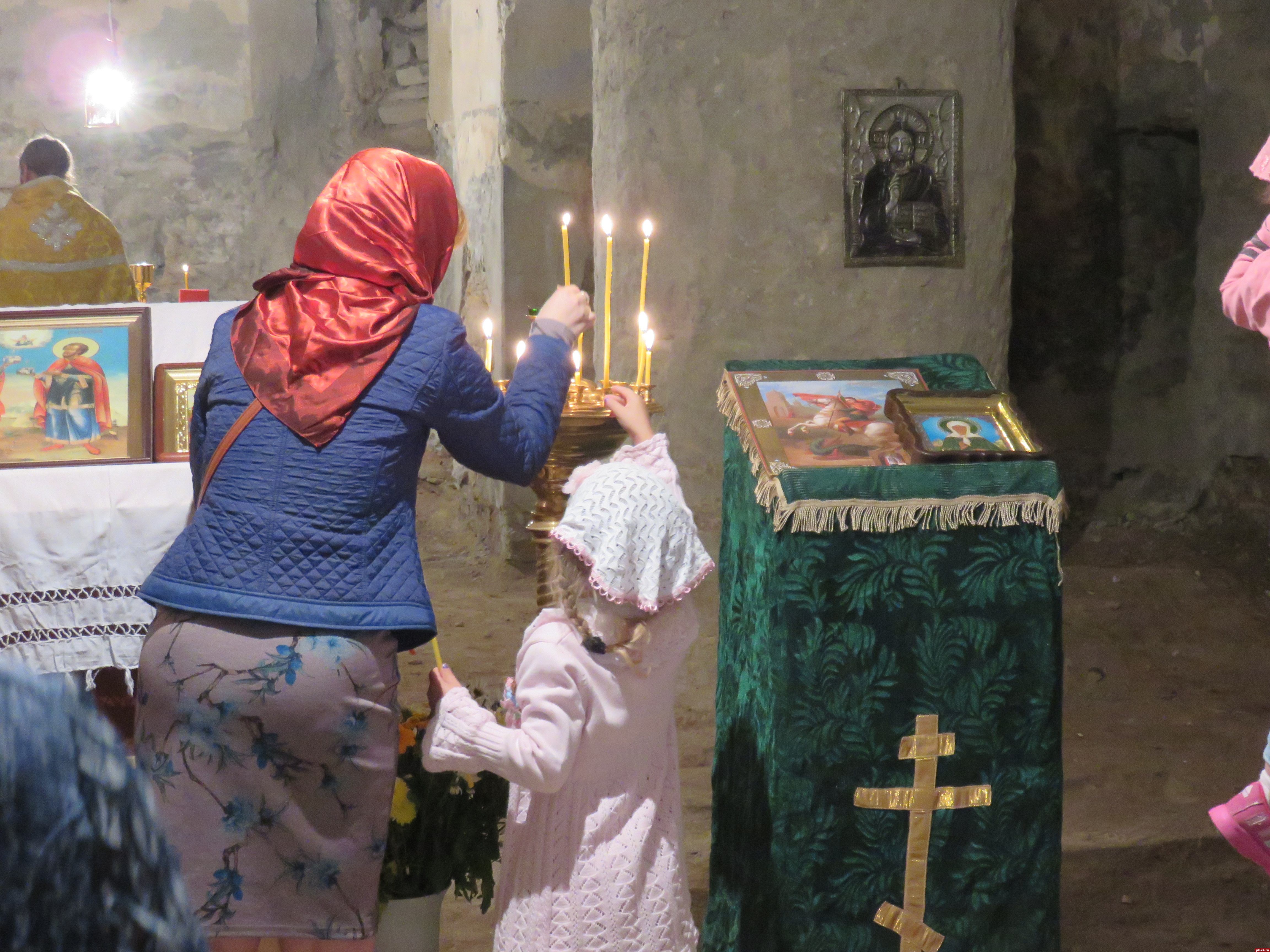 Ощущения от происходившего в храме - невероятные. Неизгладимое впечатление производит, прежде всего, сам храм - древние стены с открытой кладкой, уходящий в небо купол, завешанные тканью и забитые досками окна, через которые струятся на иконы узкие полоски света, в которых играет пыль веков... Голоса певчих, все более стройно вплетающиеся в мелодию, соборное чтение молитв, глаза детей, мерцание свечей...