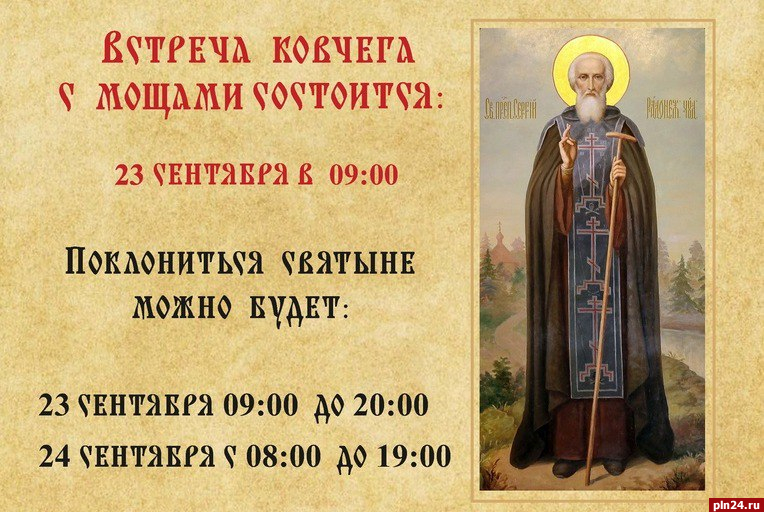 Ковчег с мощами преподобного Сергия Радонежского чудотворца принесут в Троицкий собор города Пскова 23 сентября. Ковчег встретят в 9.00.