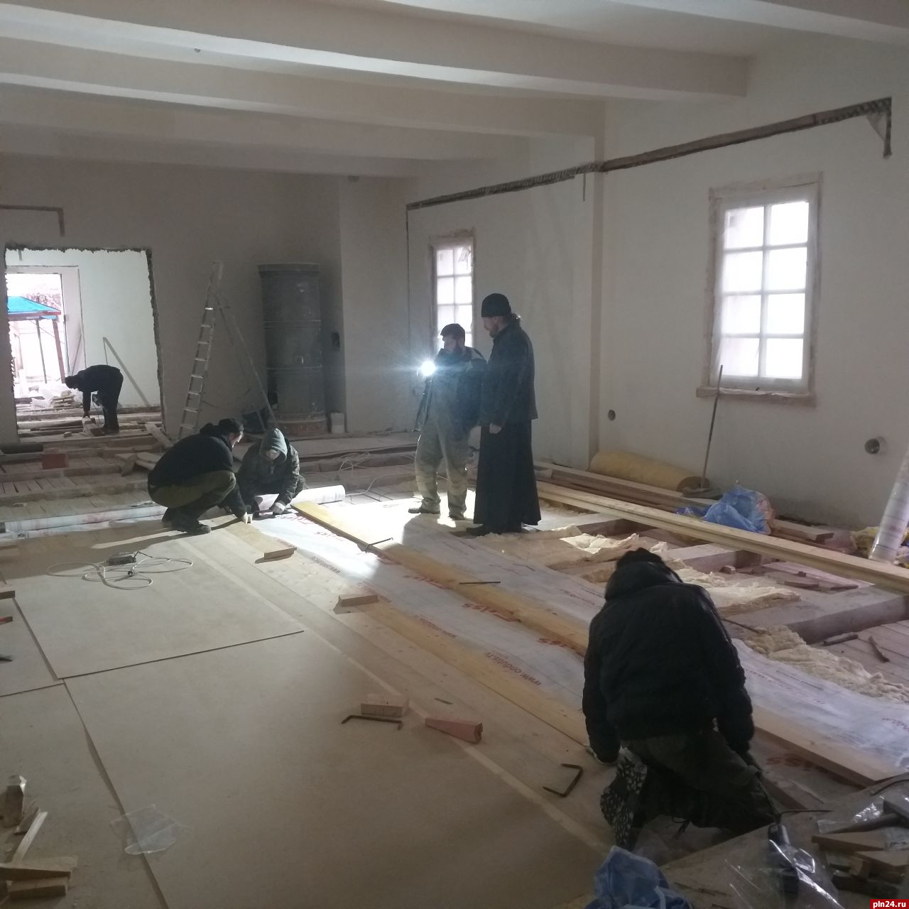 Штукатурные работы в интерьерах завершили на 100%. В храме заканчивается устройство полов из сибирской лиственницы. Рабочие укладывают утеплитель для пола. Половая доска настилается в два слоя: черновой и беловой пол, между ними - утеплитель, уточнили эксперты.