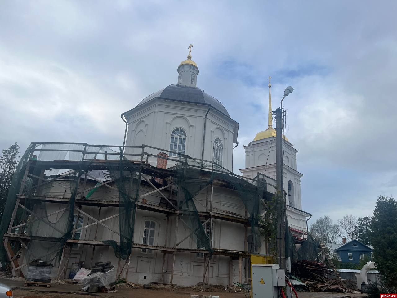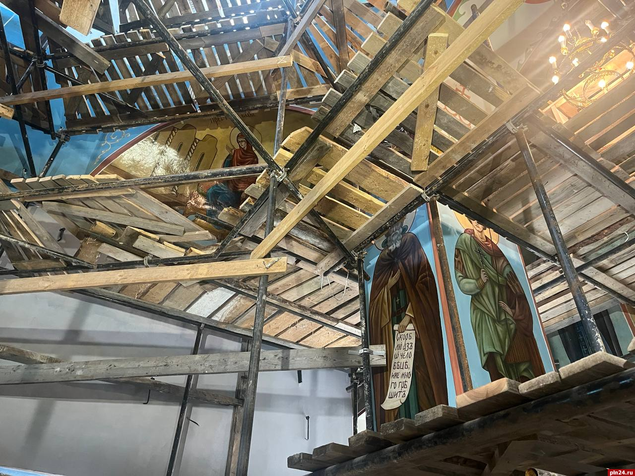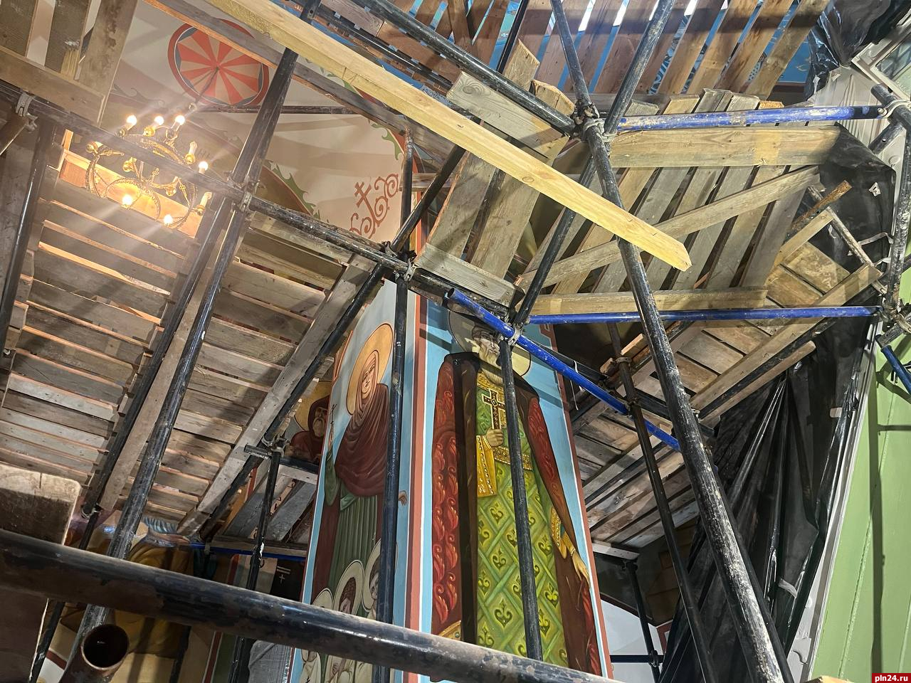 Реставрацией живописи на стенах и сводах храма занимается бригада псковских специалистов из восьми человек.