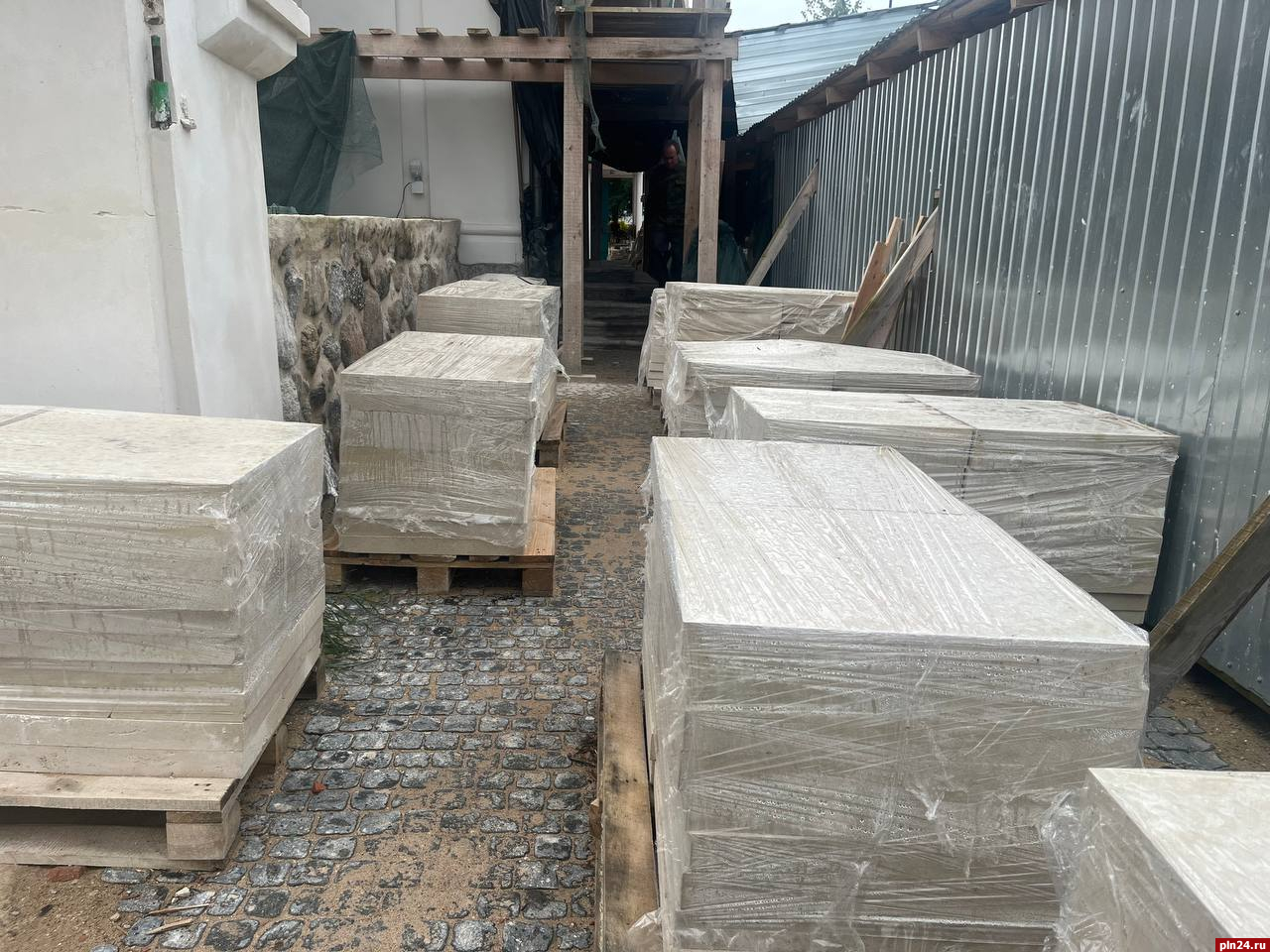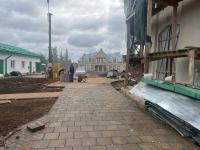 В ходе работы выполнена планировка, в соответствии с проектом. Уложен поребрик и большая часть декоративной плитки. Предстоит работа по устройству газонов и высадке декоративных растений. Для завершающих этапов реставрации храма привезены отделочные материалы. Мраморная плитка для интерьеров. Элементы для воссоздания одного из гранитных крылец.