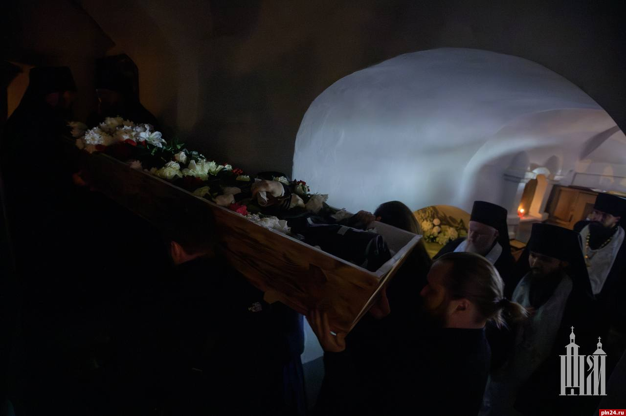 Новопреставленный монах Исидор было погребен в Богом зданных пещерах монастыря.