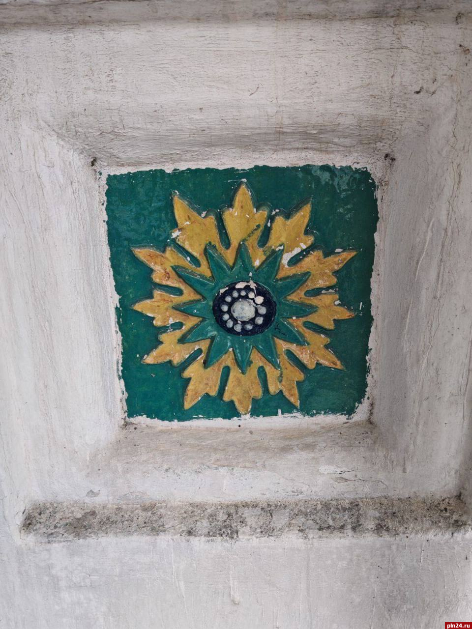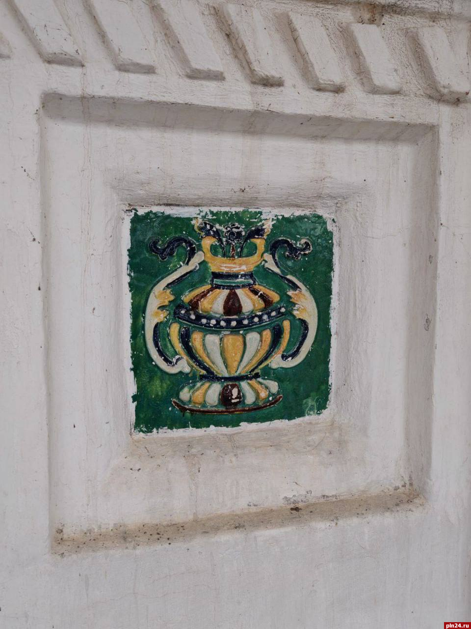 Одним из значимых открытий стало обнаружение части полихромных керамических изразцов, которые оказались скрыты контрфорсами — вертикальными конструкциями, усиливающими стены. В настоящее время проводится их реставрация. Для восполнения утрат псковские керамисты изготовили аналоги.