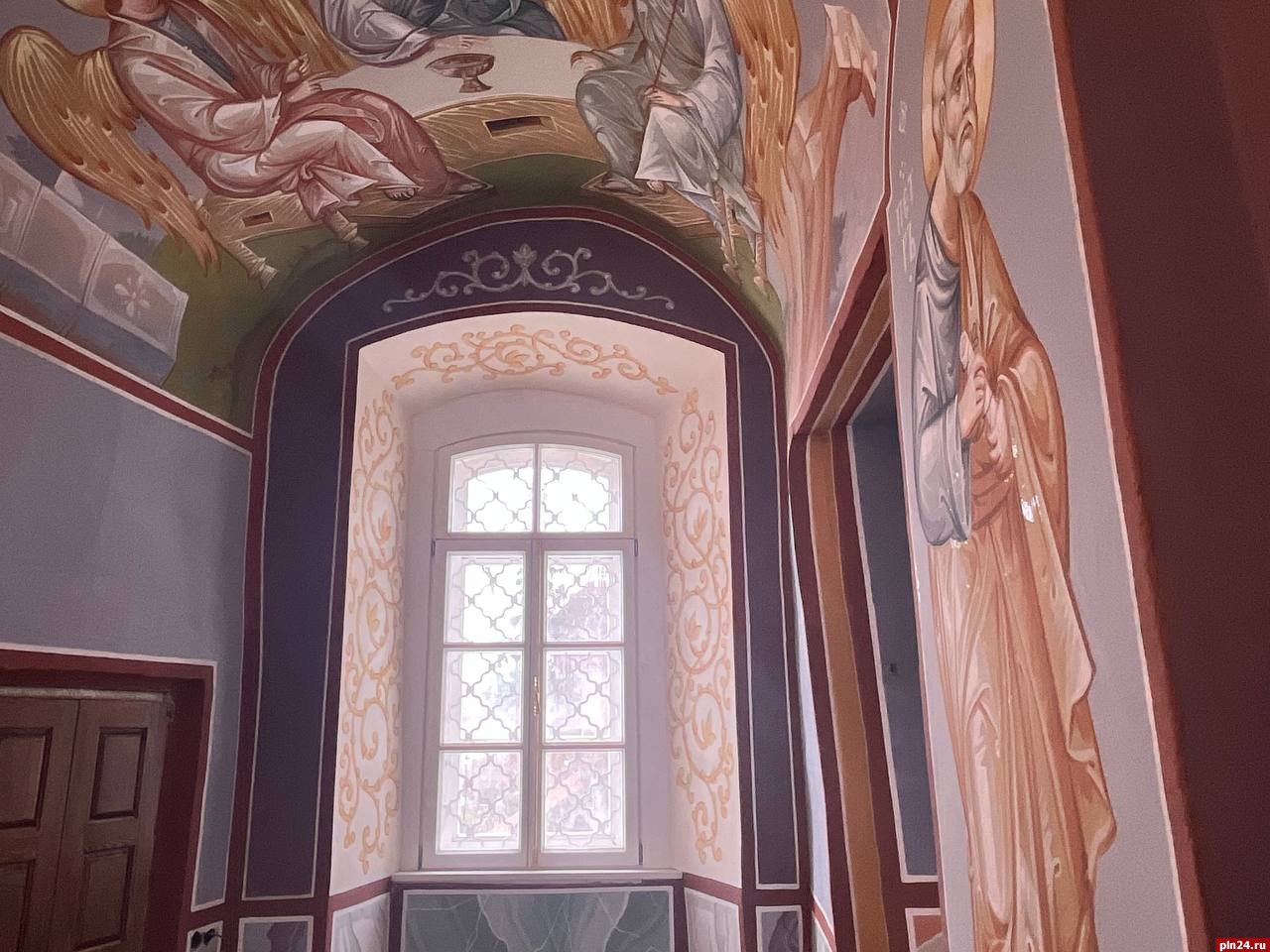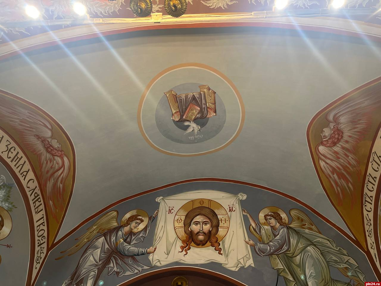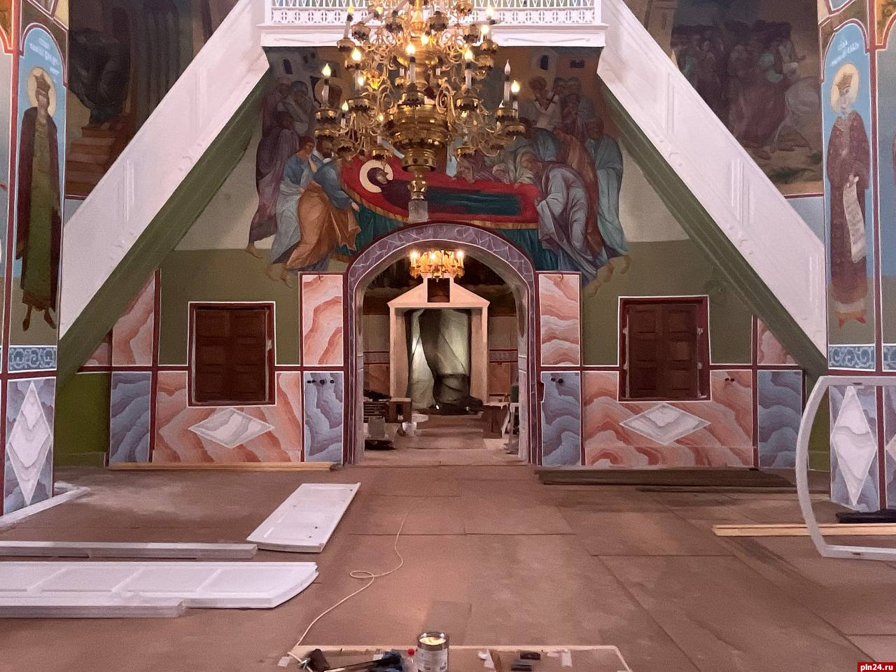 Сложная резная конструкция иконостаса уже отреставрирована и покрыта сусальным золотом. Эту работу выполнили специалисты из Санкт-Петербурга при активном участии псковскичей. Также полностью завершена реставрация настенных росписей храма.