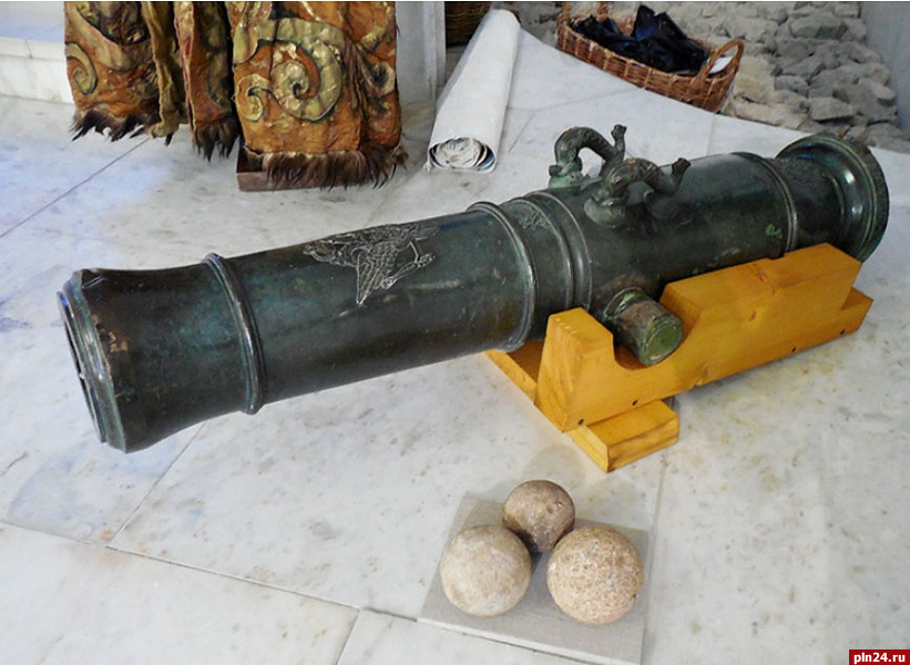 Макет потешной пушки и каменные ядра (большее по размеру датируется XVI веком). Из фондов «Михайловского»