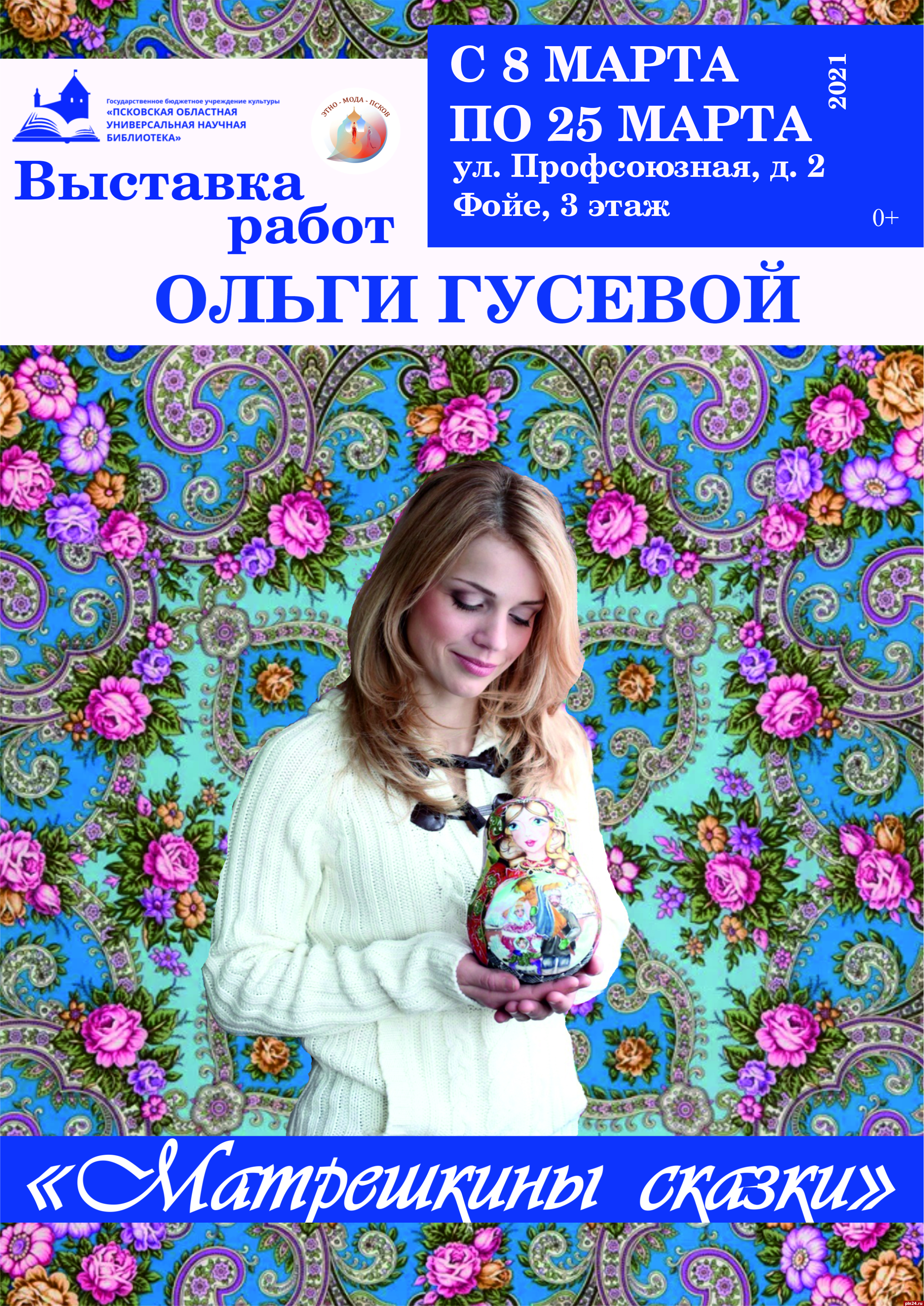 Выставка работ псковского экскурсовода Ольги Гусевой «Матрешкины сказки» и выставка плакатов «Буква - инструмент поэта» открылись в Псковской областной научной библиотеке. Об этом Псковской Ленте Новостей сообщили в пресс-службе библиотеки.