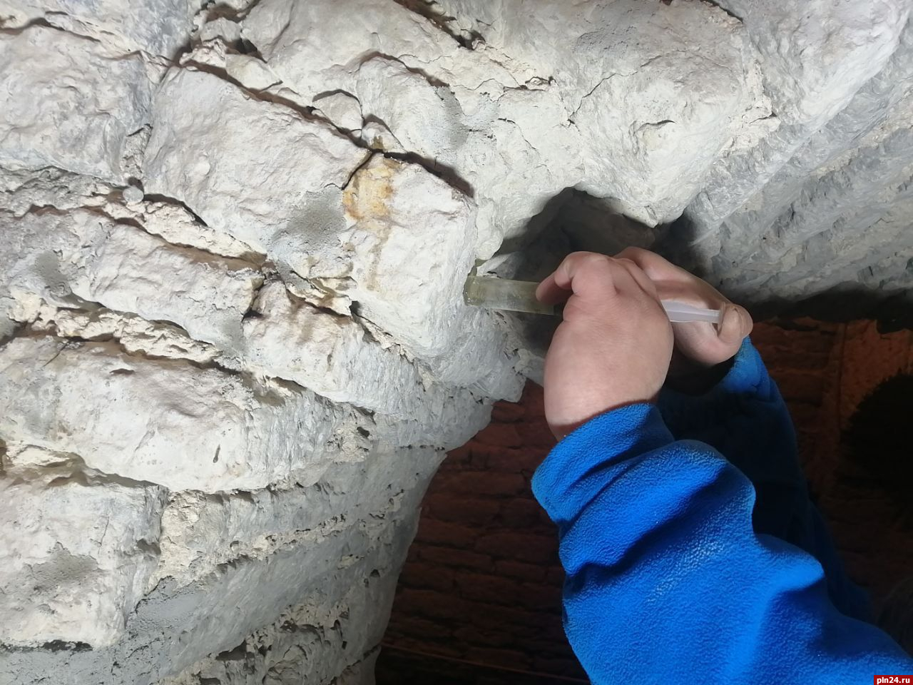 В настоящий момент реставраторы закончили вычинку пораженного грибком отсыревшего камня знаменитых псковских погребов. Несколько раз провели антисептическую обработку стен. Начинаются реставрационные работы с применением «здорового» камня.