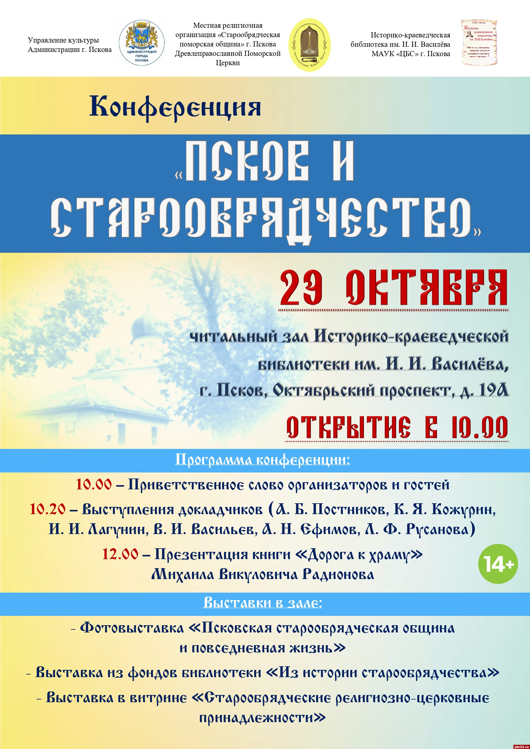 Конференция «Псков и старообрядчество» состоится 29 октября в читальном зале Историко-краеведческой библиотеки имени И. И. Василёва. Об этом Псковской Ленте Новостей в централизованной библиотечной системе города Пскова.