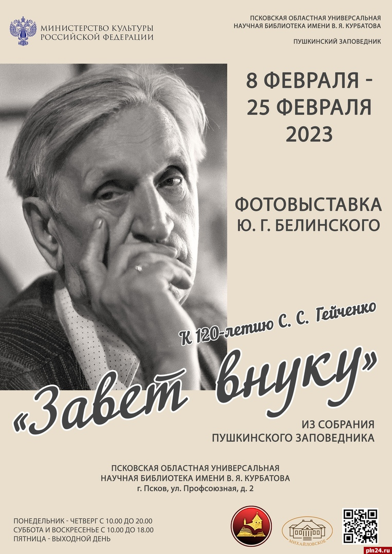 Презентация фотовыставки «Завет внуку» из фондов Государственного музея-заповедника А. С. Пушкина «Михайловское» состоится в Пскове 13 февраля в 15:00. Об этом Псковской Ленте Новостей сообщили в Центре туризма и творческих индустрий Пскова.