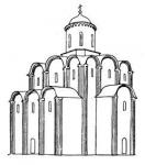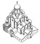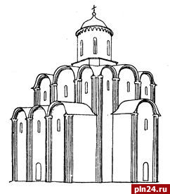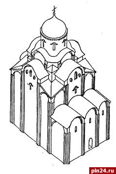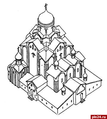 На изображениях представлены Троицкий собор Пскова в XII века, XIV века, XV-XVI веков. Это варианты реконструкций, опубликованные Юрием Спегальским.