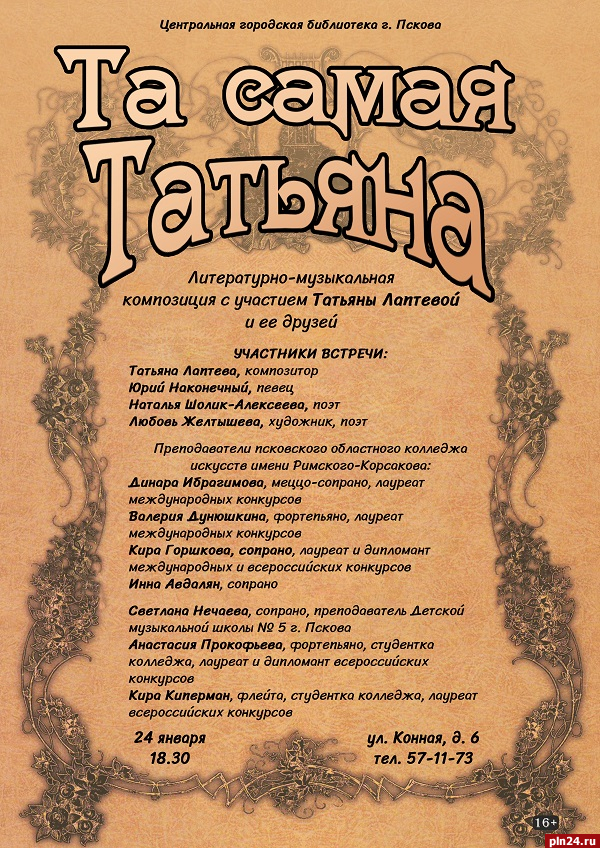 Литературно-музыкальную композиция «Та самая Татьяна» с участием композитора Татьяны Лаптевой и ее друзей пройдет в Центральной городской библиотеке (Псков, улица Конная, 6) 24 января в 18.30. Об этом Псковской Ленте Новостей сообщили в учреждении.