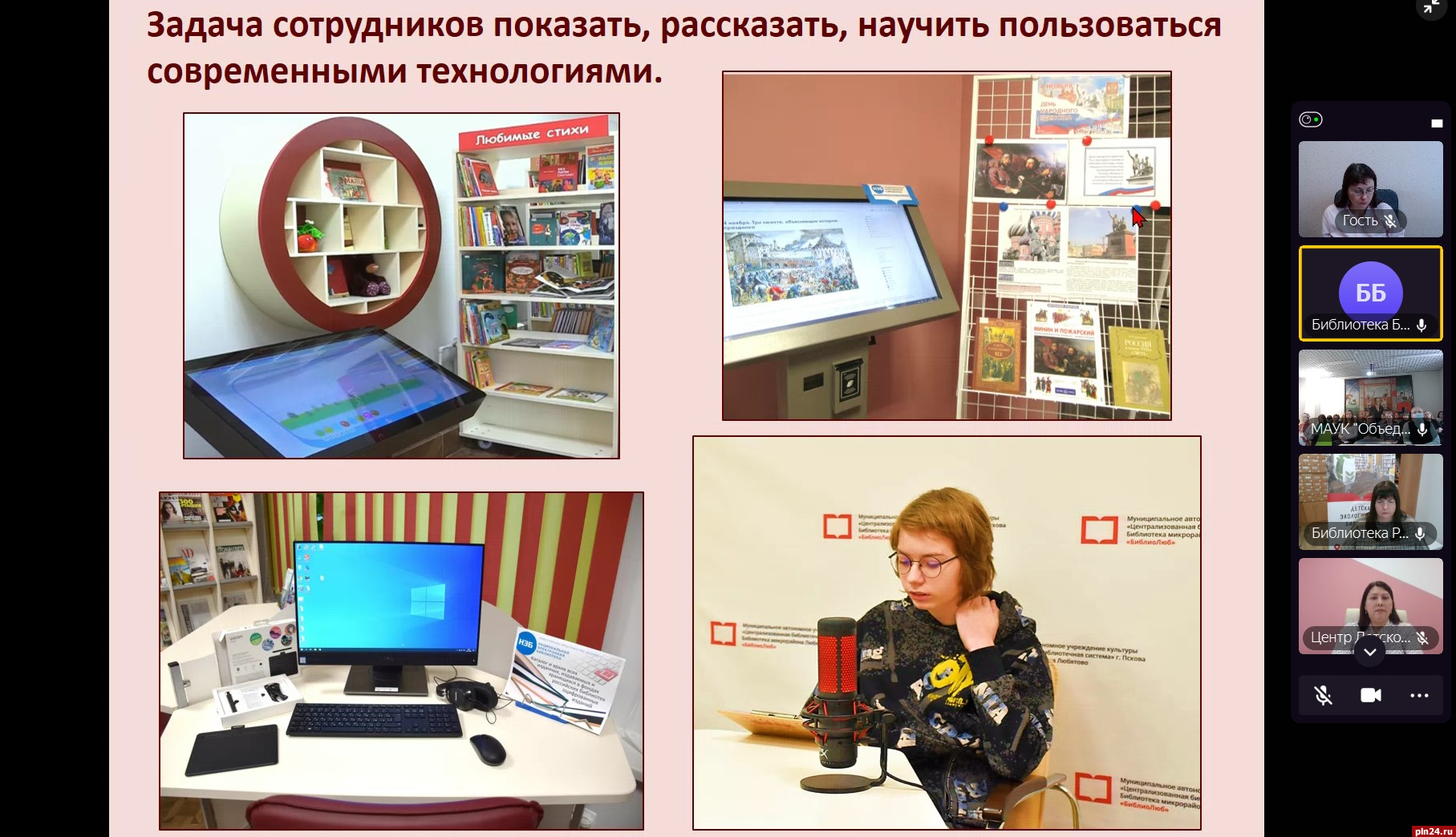 Заведующая Детской экологической библиотекой «Радуга» Ольга Незнанова показала участникам онлайн-конференции, какой неприглядной эта библиотека была до модернизации и какой великолепной она стала после, а также рассказала, как новые технических возможности помогают псковским библиотекарям реализовать многочисленные программы по экологическому просвещению подрастающего поколения. Библиотекари из Чебоксар позавидовали, что у псковичей есть специальная детская экологическая библиотека, и пообещали взять на вооружение её интереснейший опыт.