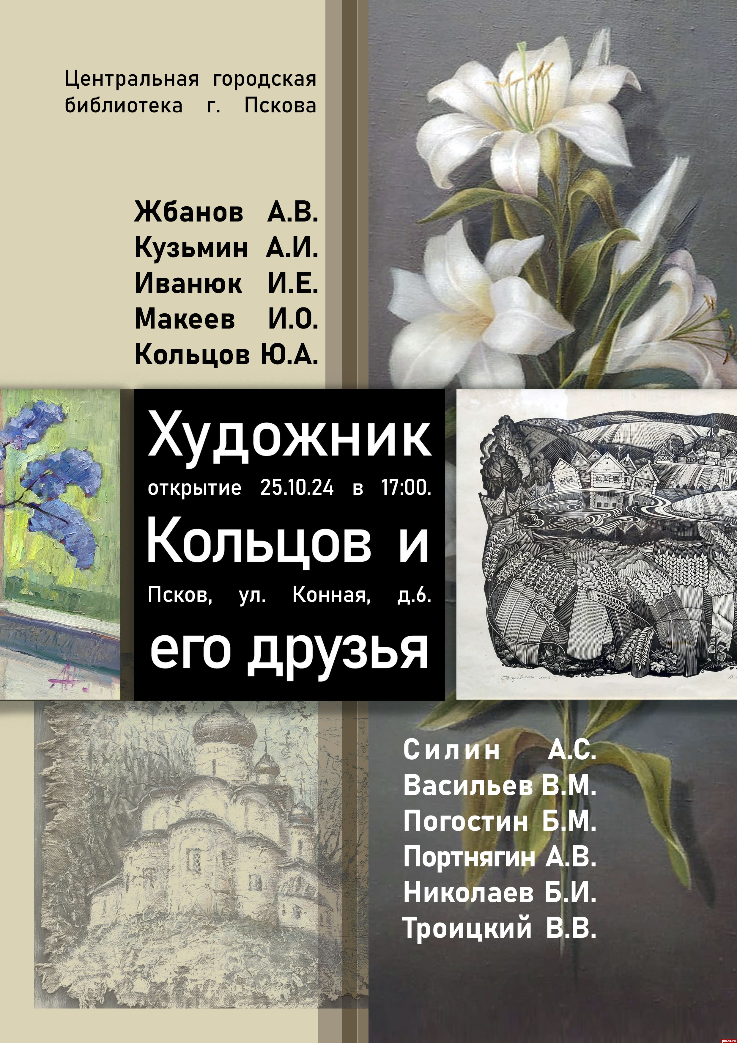Центральная городская библиотека Пскова приглашает на открытие выставки «Юрий Кольцов и его друзья» в проекте «Коллекция» 25 октября в 17.00. В экспозиции будет представлено 25 работ художников из Пскова в ретроспективе от 90-х годов прошлого века до нынешних дней. Художник и коллекционер Юрий Кольцов показывает живопись и графику мастеров разных поколений, среди которых его учителя, друзья, знакомые, которые учились в Детской художественной школе. Об этом Псковской Ленте Новостей сообщили в библиотеке.
