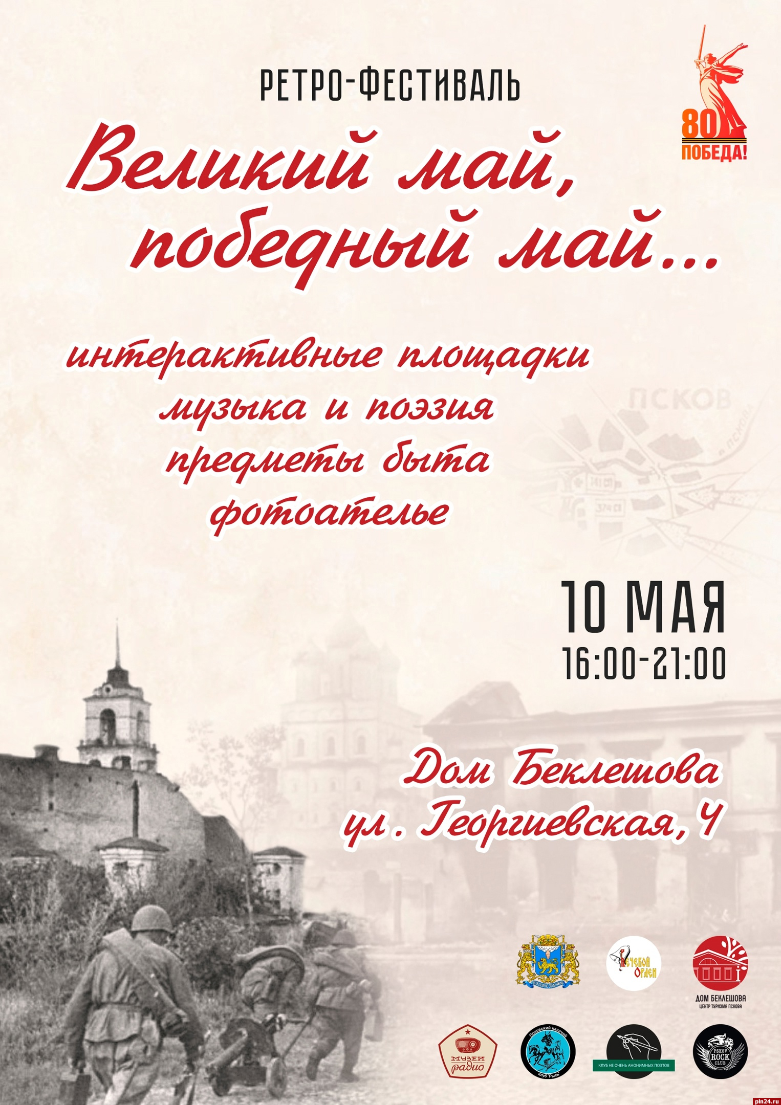 На открытой площадке Усадьбы Беклешова (улица Георгиевская, 4) 10 мая в 16:00 пройдёт ретро-фестиваль «Великий май, победный май», посвящённый 80-летию Победы в Великой Отечественной войне. Об этом Псковской Ленте Новостей сообщили в молодёжной организации «Вечевой Орден».